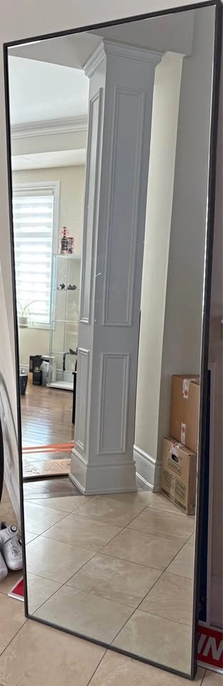 Large full length mirror with a modern slim black frame. Perfect for your bedroom, hallway, dressing room, or entryway. It offers a very clear reflection and is in good condition. Great for home decor, outfit checks, or small spaces. Can lean against the wall or be mounted. Pickup in King City.