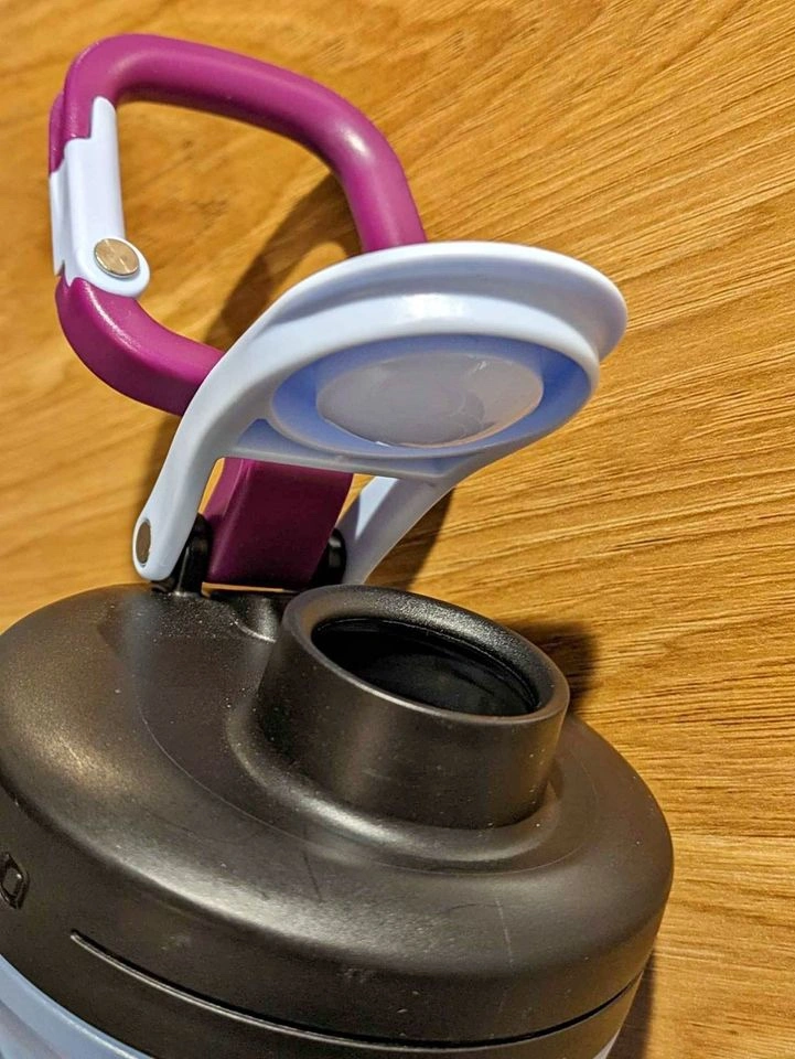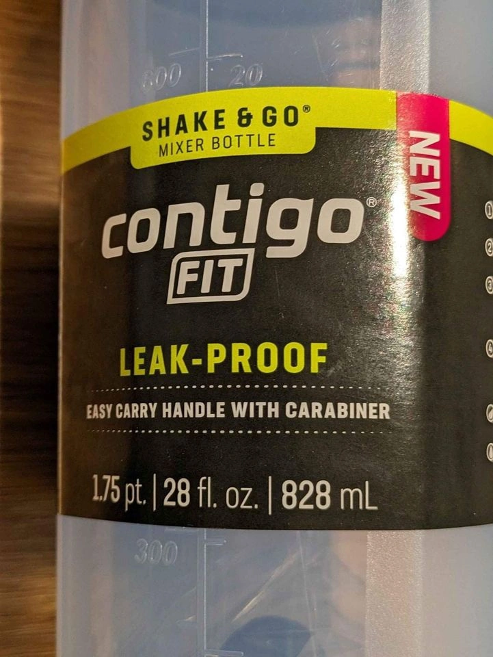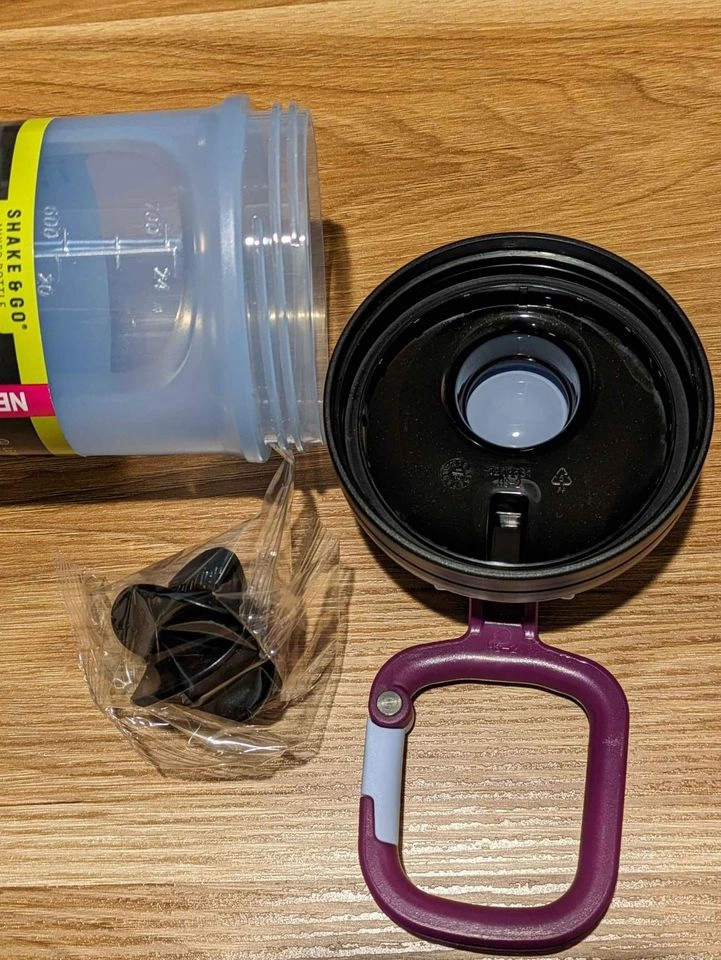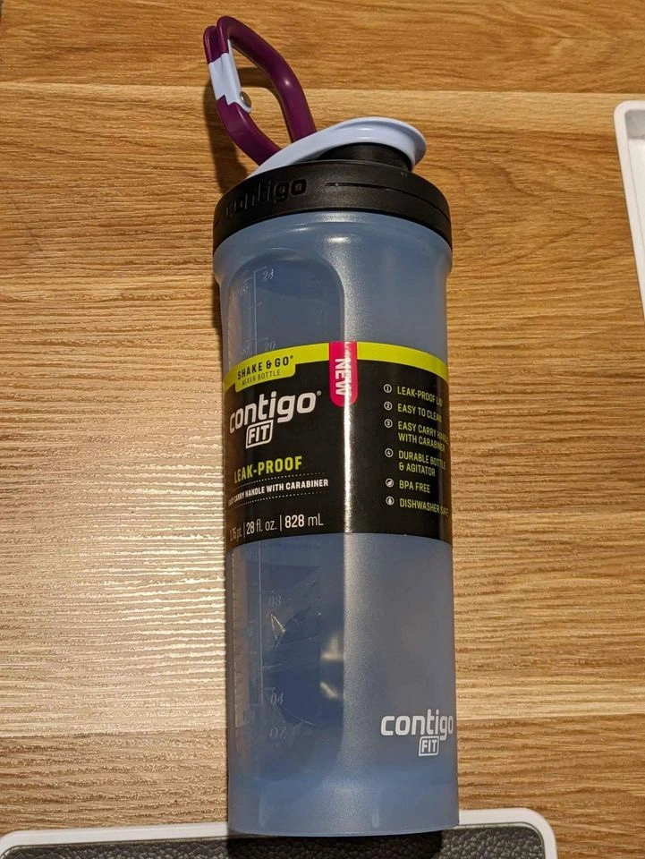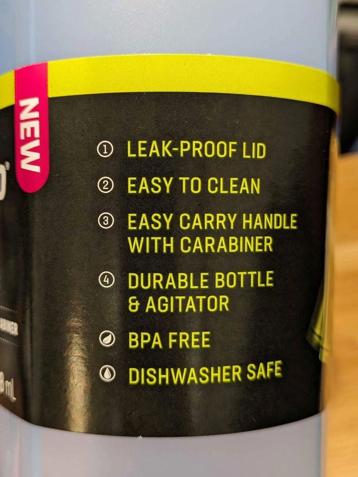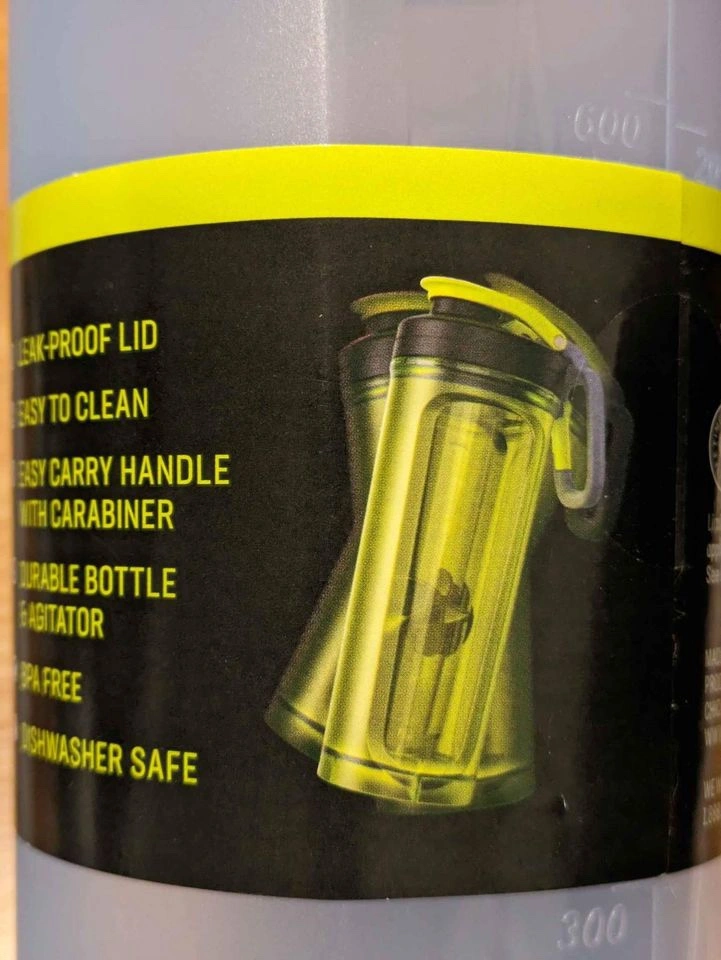 Bottle with agitator and carabiner handle. Dishwasher safe, BPA free.