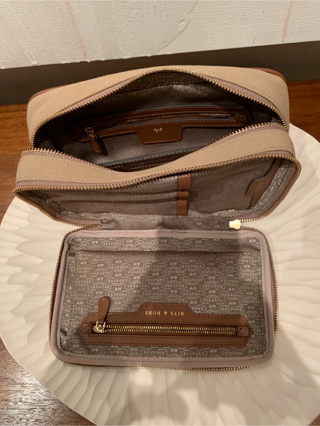 Details: Two sections. Top section has a zipped pocket labelled ‘UNMENTIONABLES’ and an open pocket labelled ‘TOOLS’. Main section has a zipped pocket. Applique leather initials and leather tassel zip pulls.