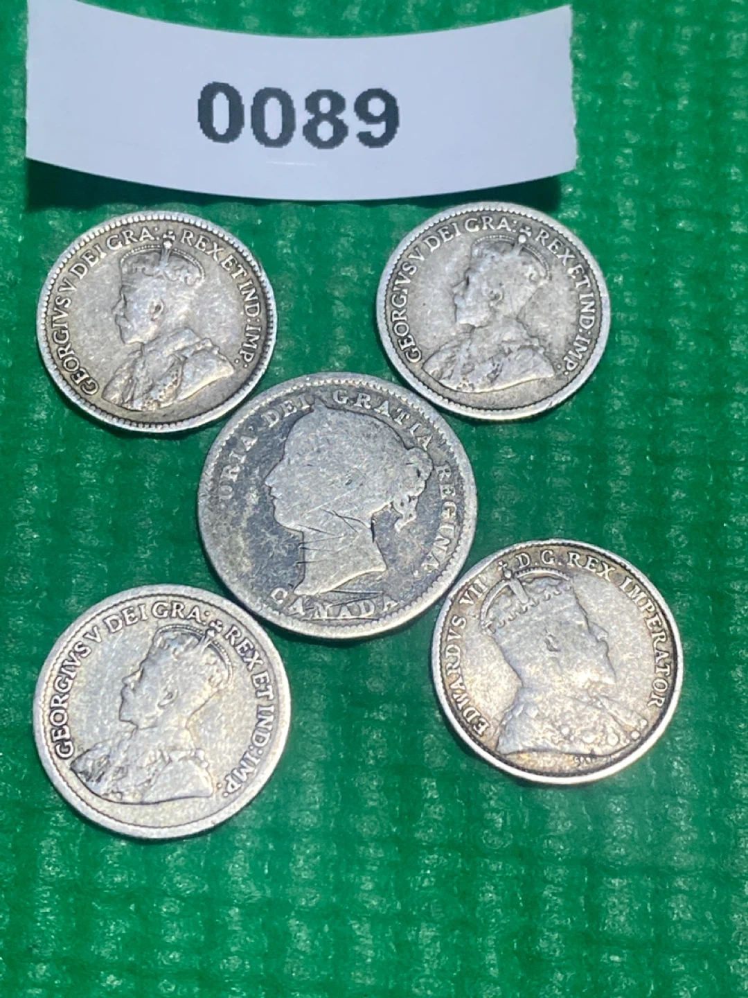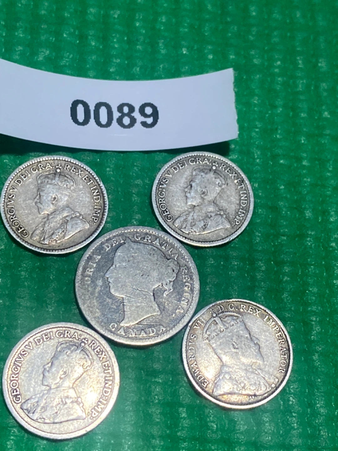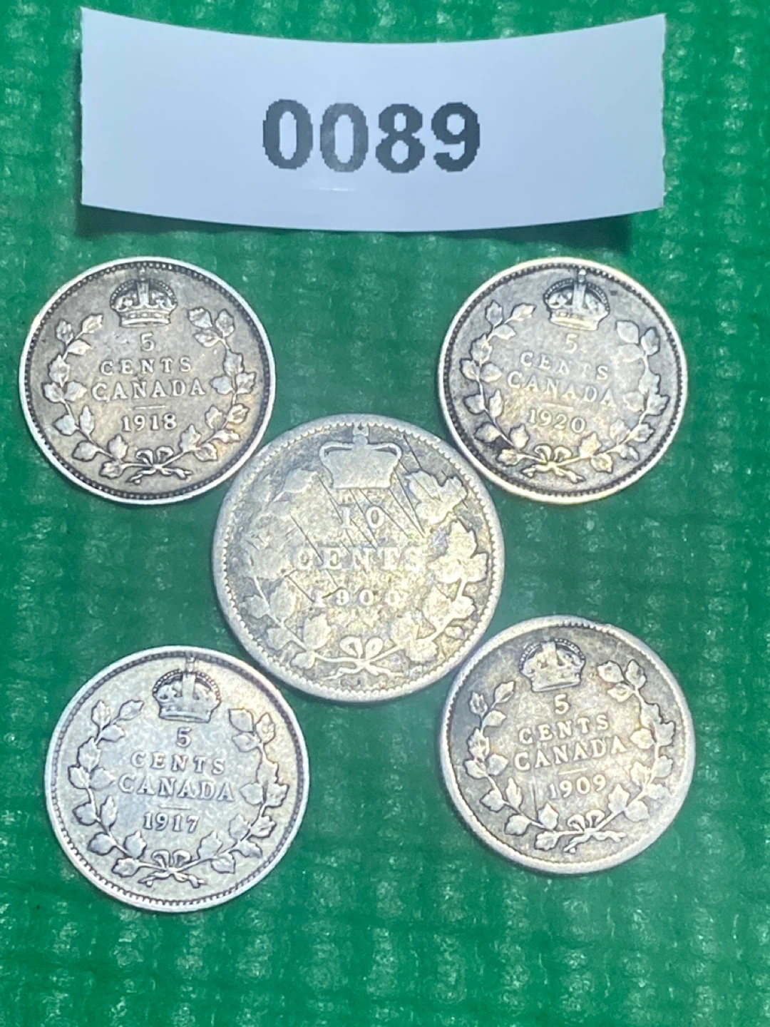 This is a collection of five Canadian 5 cent coins. Dates visible include 1909, 1917, 1918, 1920, and one unreadable coin likely from the early 1900s. These coins are made of silver. They'd be a great addition for any coin collector!