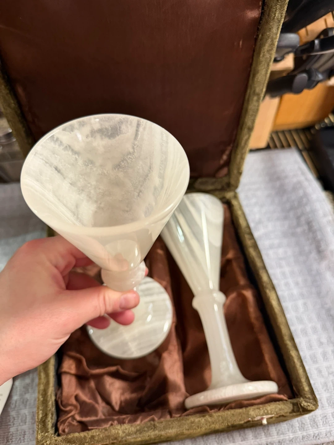 Selling a set of two Dix Mille Villages wine glasses made of onyx. They come in a velvet-lined box, perfect for gifting or display. The onyx has a beautiful translucent quality with colours varying from white to green to brown. These handcrafted glasses are from Pakistan.