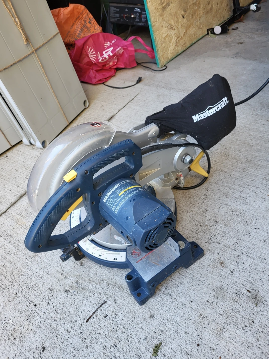 This Mastercraft compound mitre saw is designed for precise cuts. It features a dust bag to help keep your workspace tidy. Great for various woodworking projects!