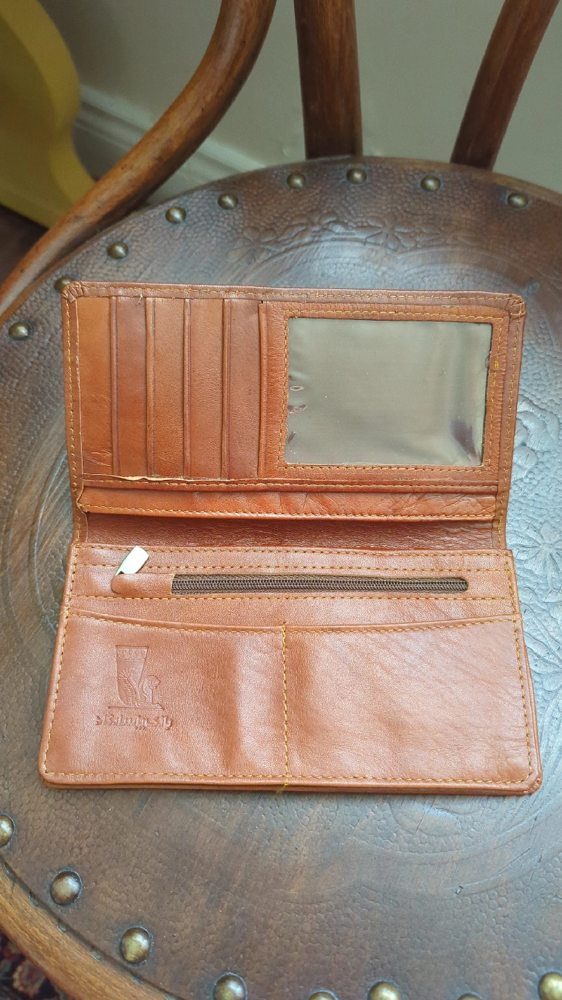 A gently used brown leather wallet. It has slots for cards and a zippered compartment for coins. It's a great size for everyday use and fits comfortably in your pocket or bag