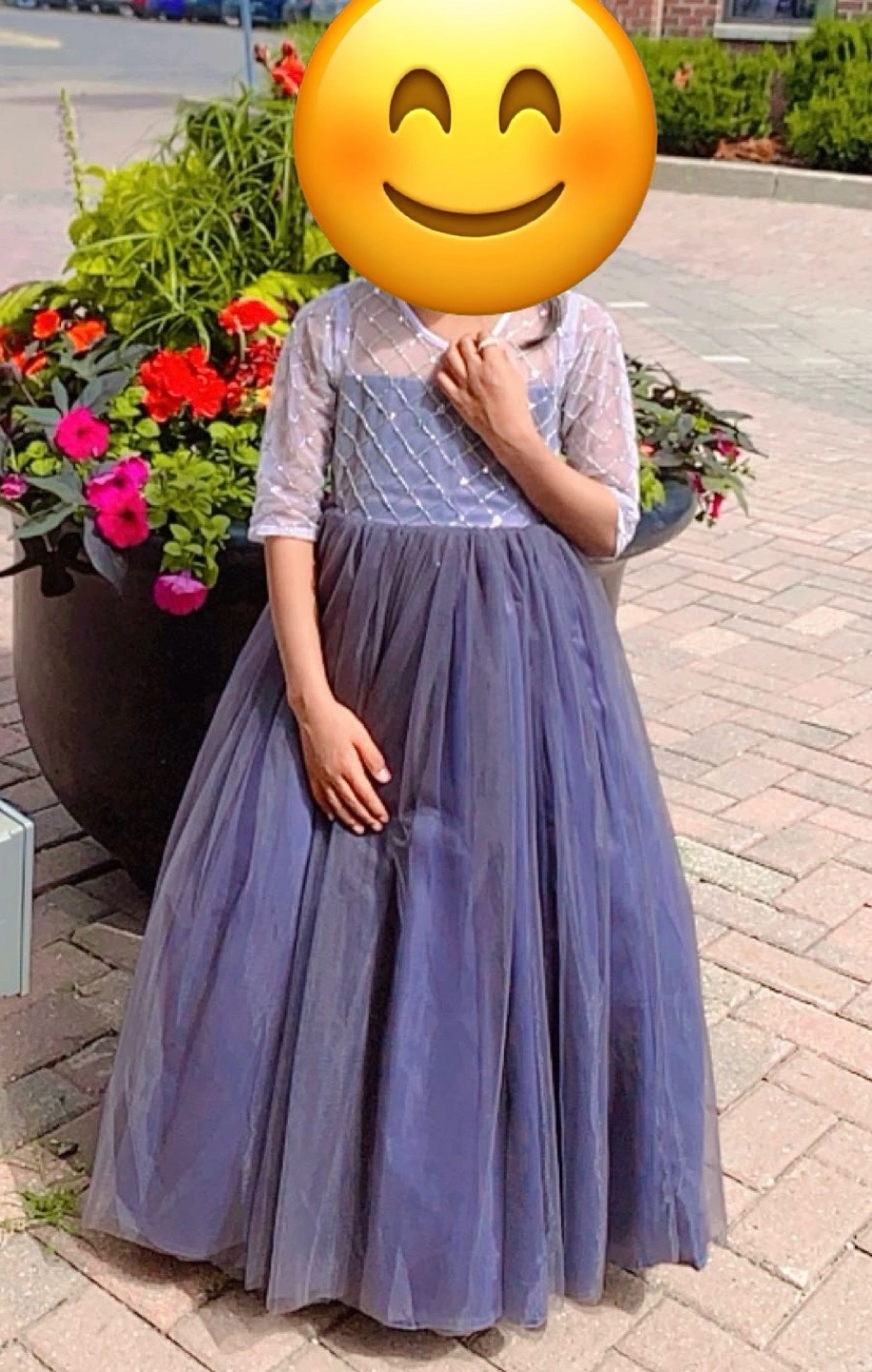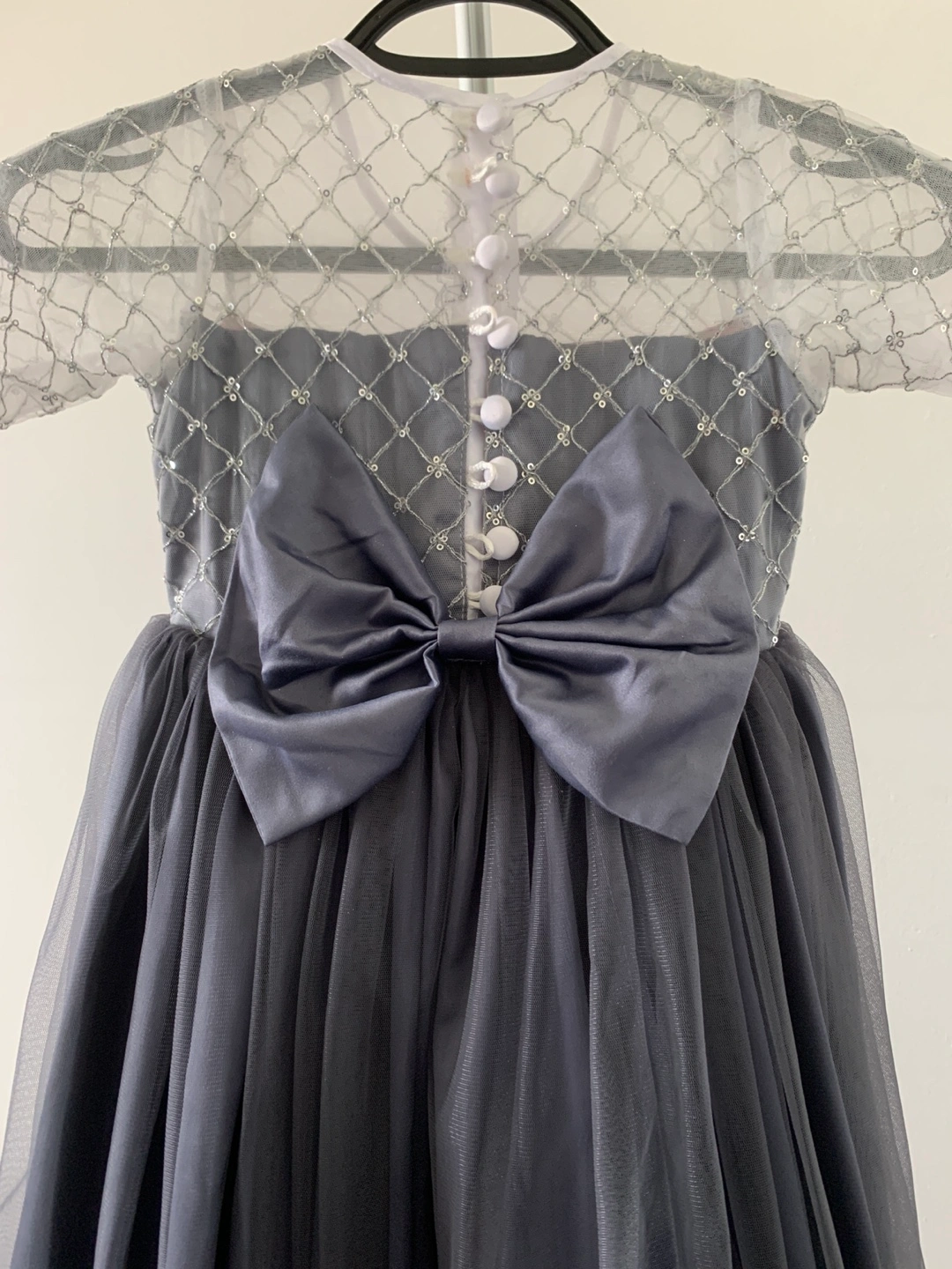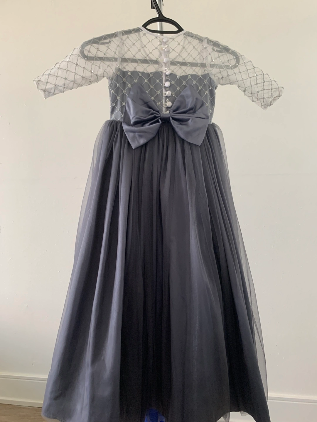 Beautiful grey tulle dress. Features a sheer bodice with silver sequin detailing. Three-quarter sleeves. Back bow and button closure. Perfect for special occasions.