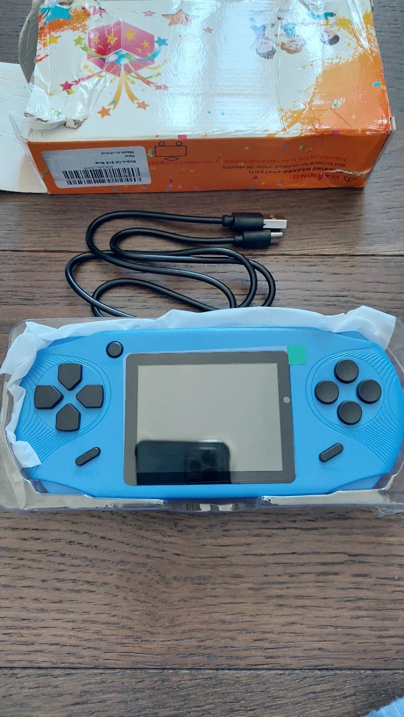 This is a blue handheld game console. It comes with a USB charging cable. It's not suitable for children under 36 months due to small parts.