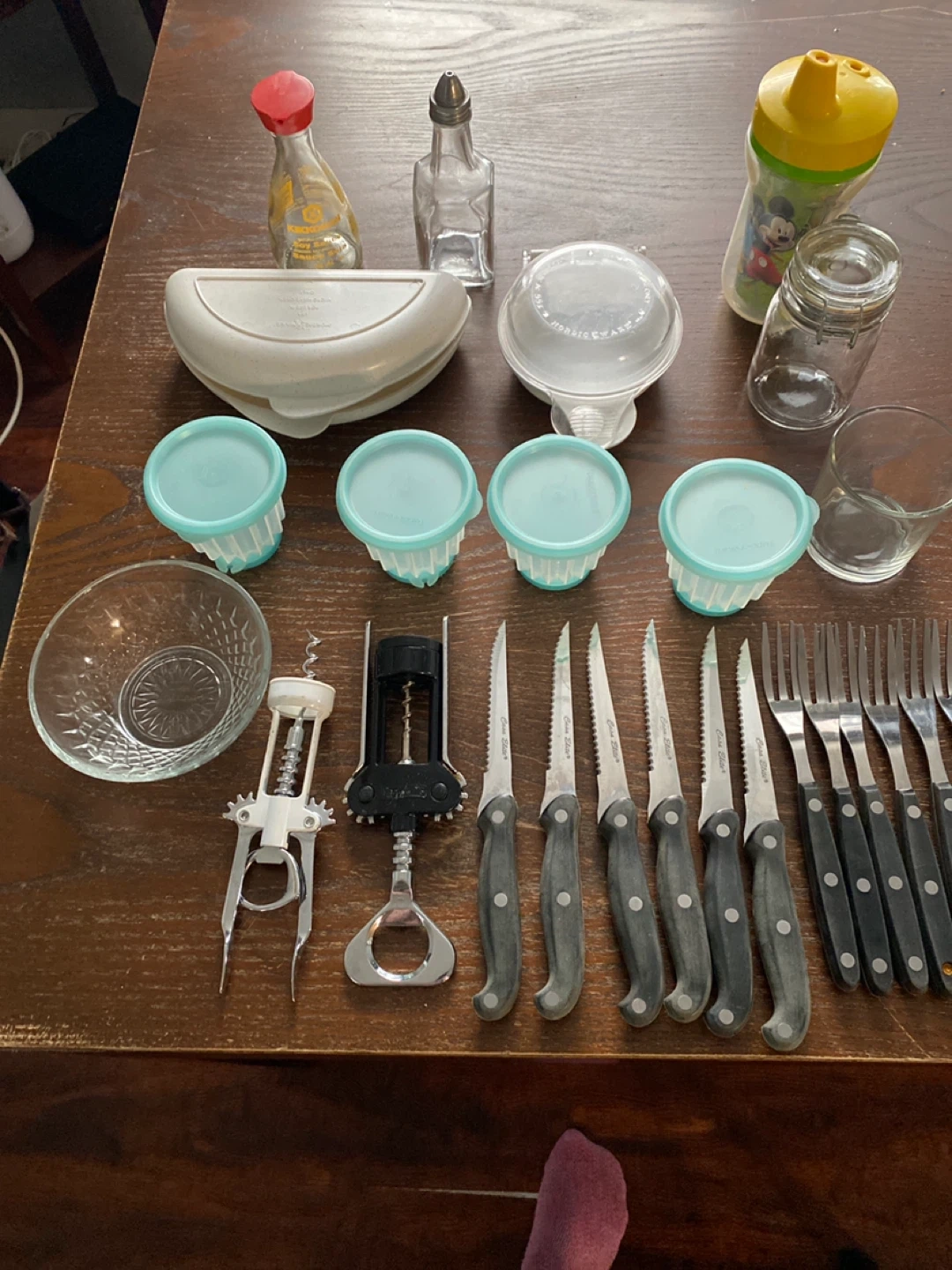 This lot includes a variety of kitchen items. You'll find two corkscrews, six steak knives, and six forks. It also comes with four lidded containers and a glass bowl, plus a Mickey Mouse sippy cup. A glass cruet and a soy sauce bottle are also included.