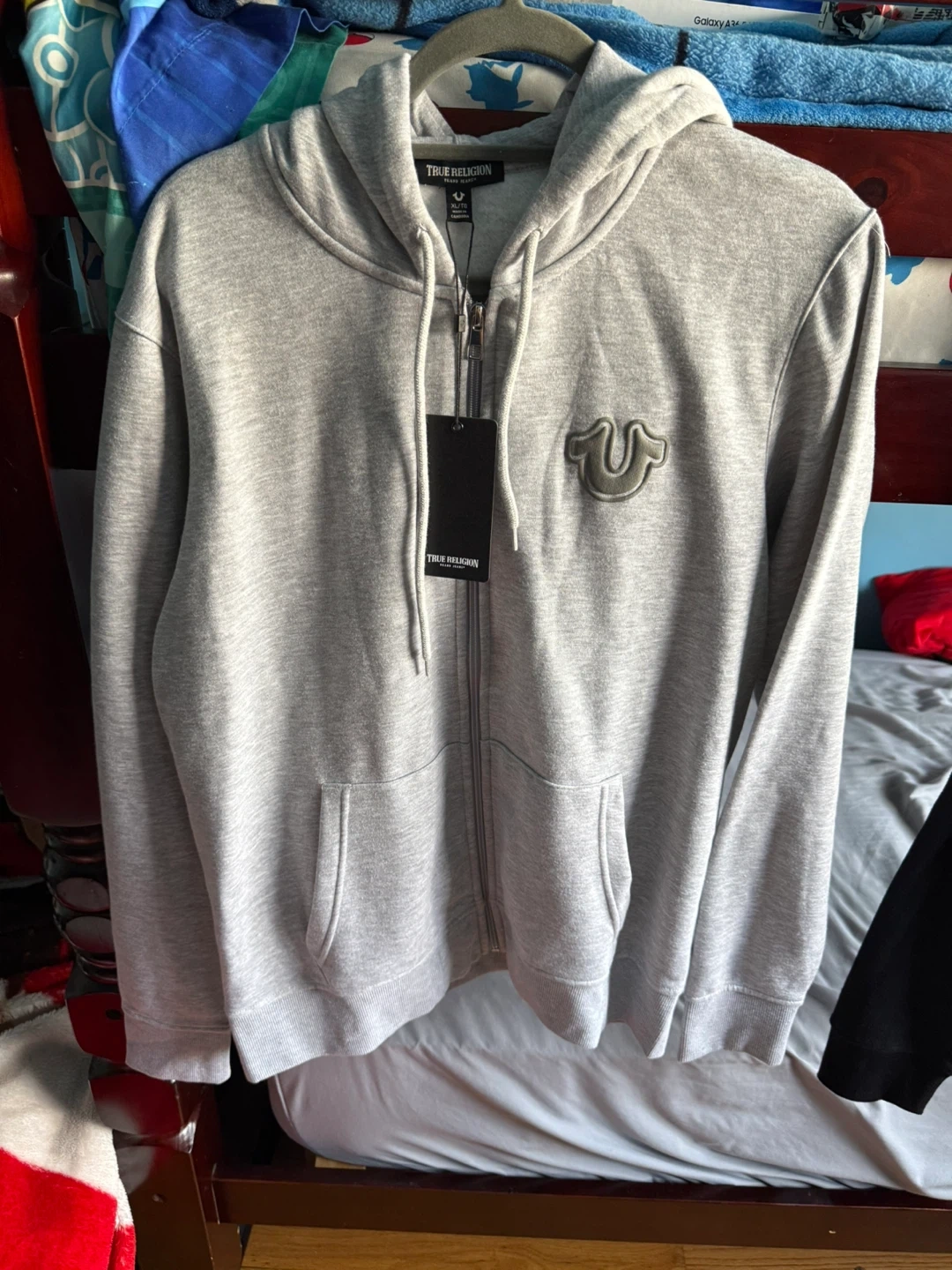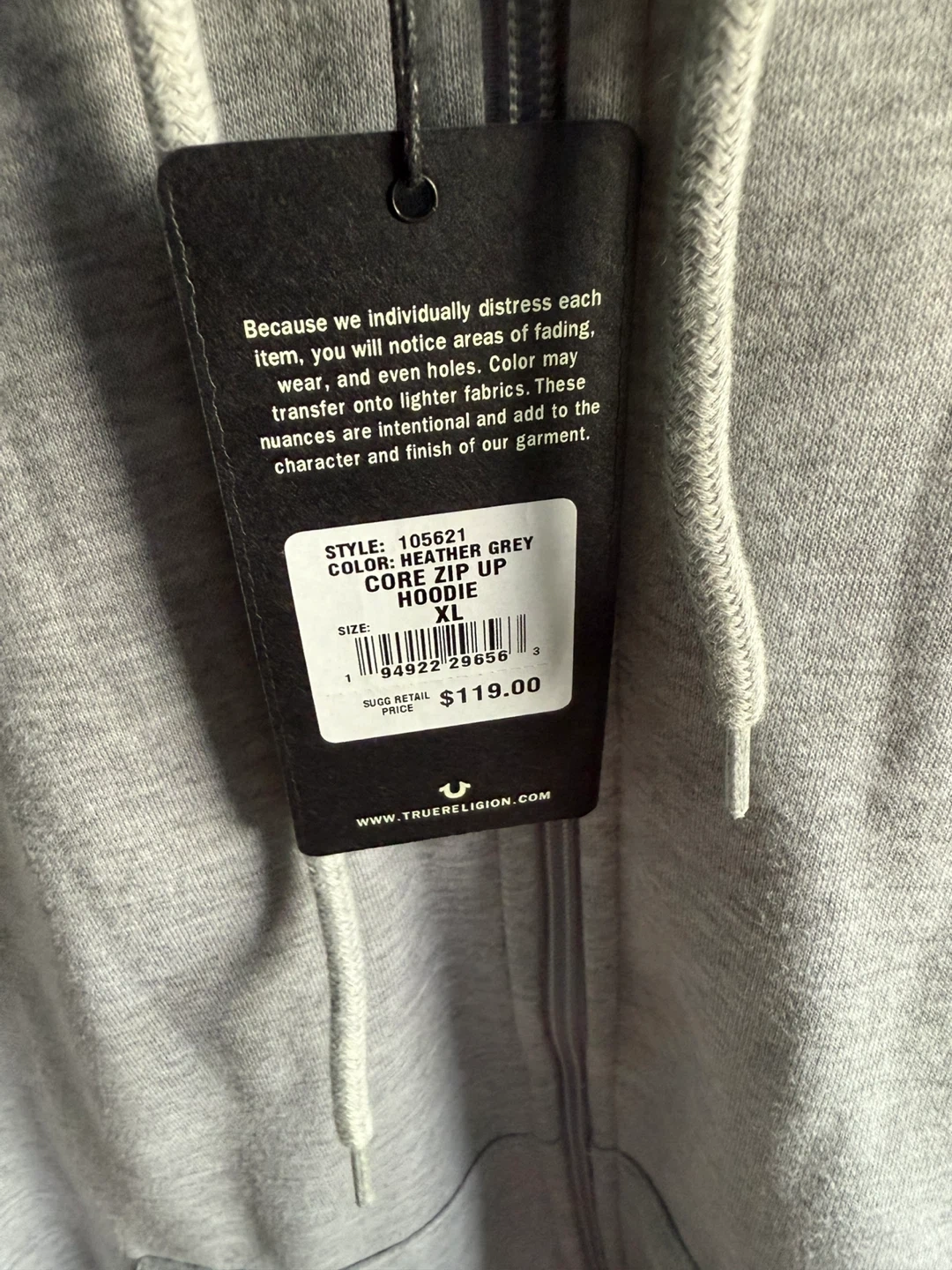 True Religion hoodie in size XL. It's a heather grey core zip up hoodie.
