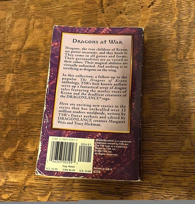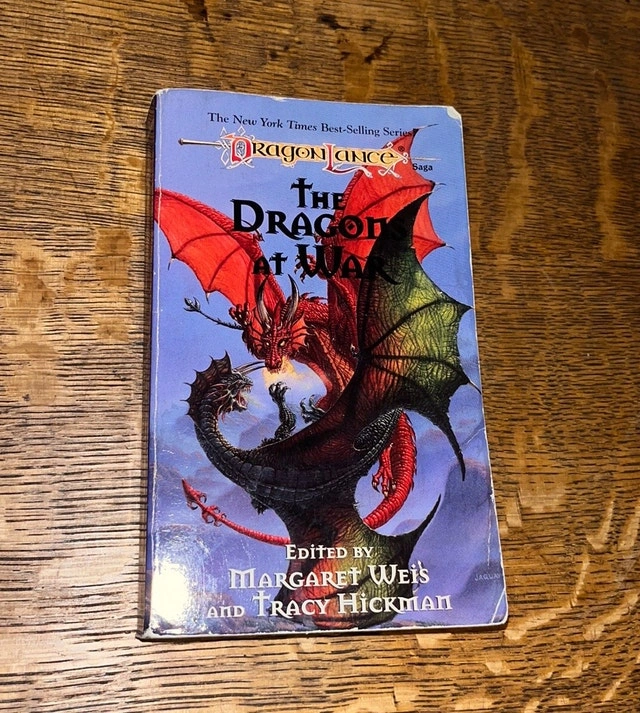 Dragonlance book from the Dungeons and Dragons world. The Dragons at War edited by Margaret Weis and Tracy Hickman. Short stories about or involving the dragons of Krynn. Paperback. Great for fantasy novel fans and game players. Enjoyable read. $8. Near the Burlington/Oakville border.
