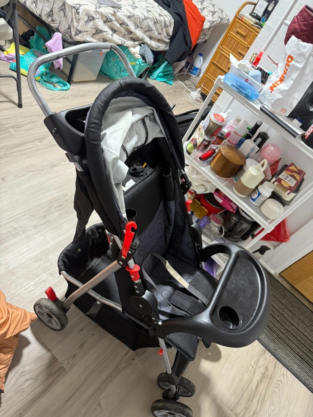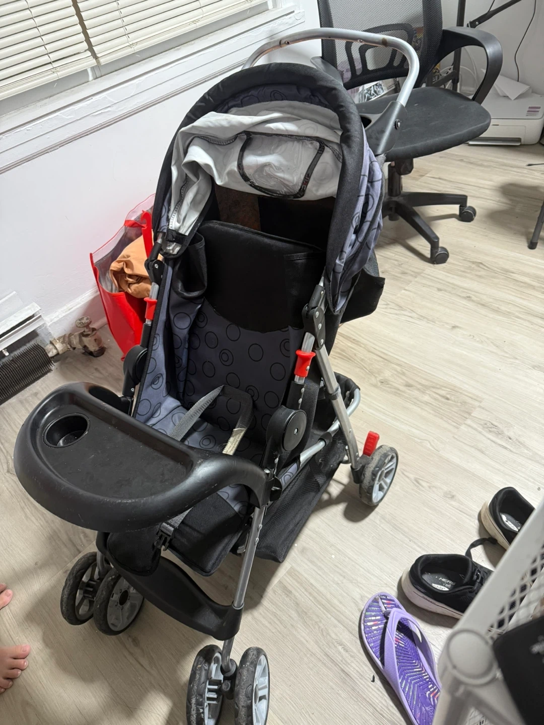Selling a used baby stroller in black and gray. It has a tray for snacks and drinks, and a comfortable seat for your little one. Perfect for walks in the park or trips to the store!
