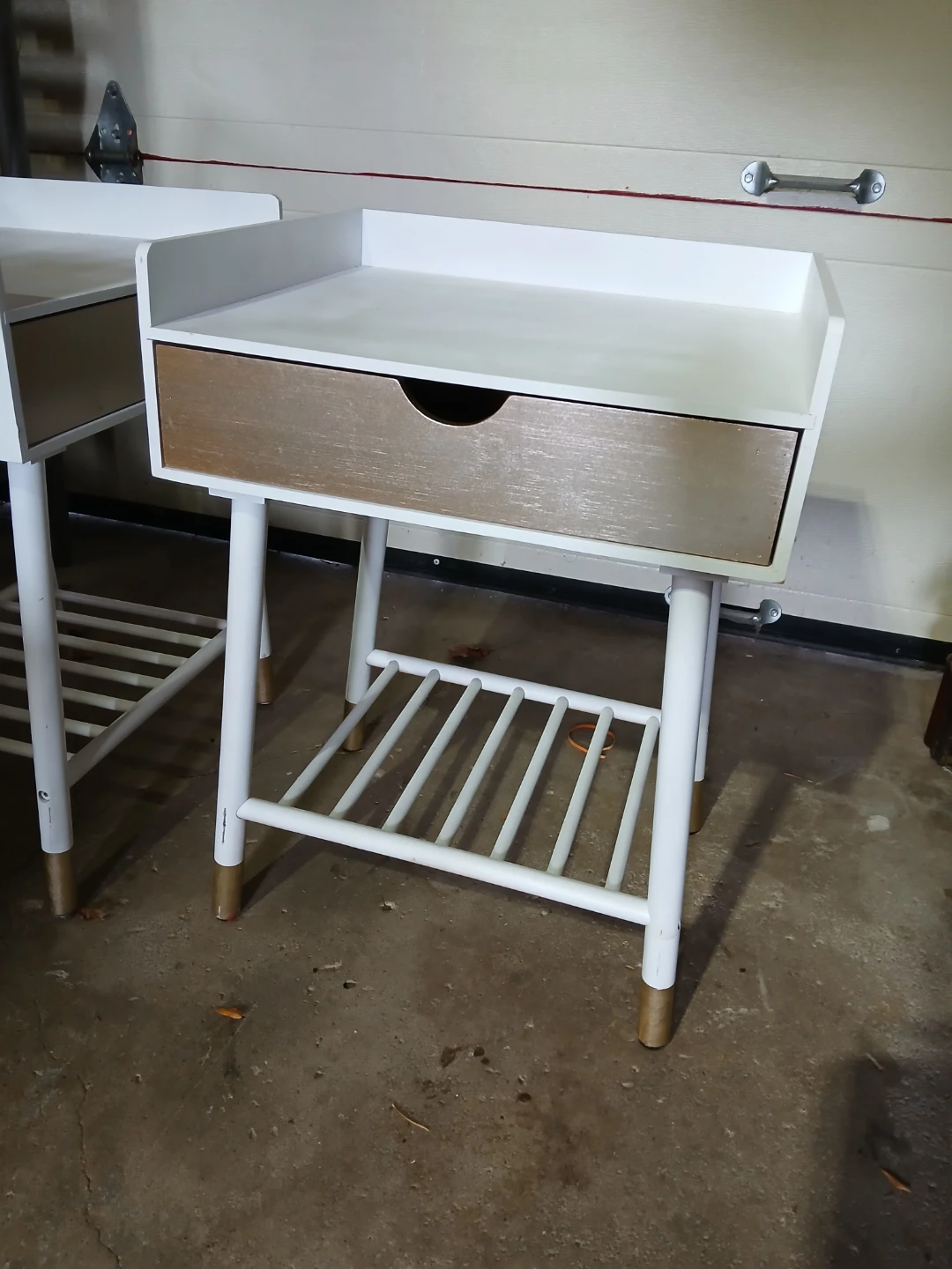 Each table has a good sized drawer, gold feet and a lipped edge around the top. Solid wood, a few signs of wear as they were used for staging. Asking $25/each but willing to give a bundle price