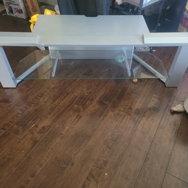 Silver TV stand with glass shelf. The stand is sturdy and has a modern look. It is the perfect size for most TVs. The glass shelf is perfect for storing your electronics or other items. The stand is in good condition and ready to be enjoyed in your home. Please note that this stand is not a smart TV stand. I did a quick wipe down but needs a good clean. Pick up near Rutherford and Williams cross posting. Pet friendly