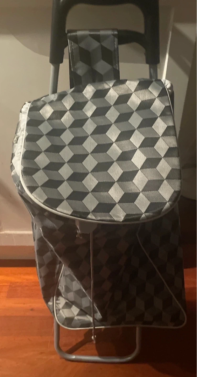 This is a shopping trolley bag with a cube pattern. It's made of fabric and has a sturdy handle. Perfect for carrying groceries or other items.