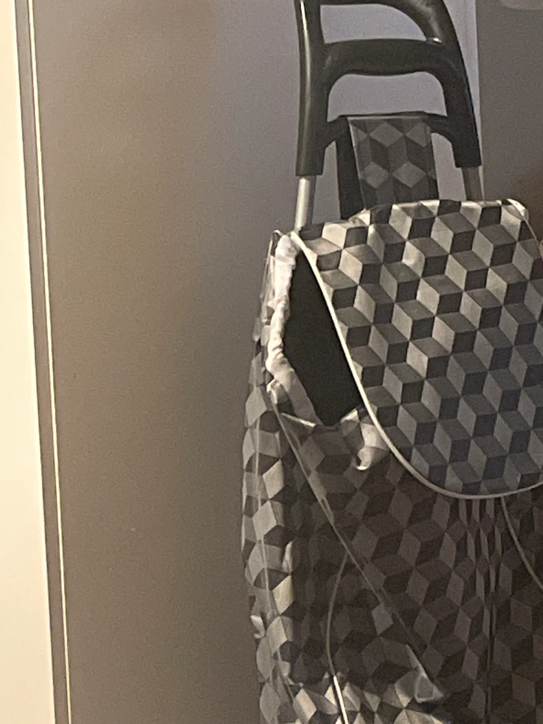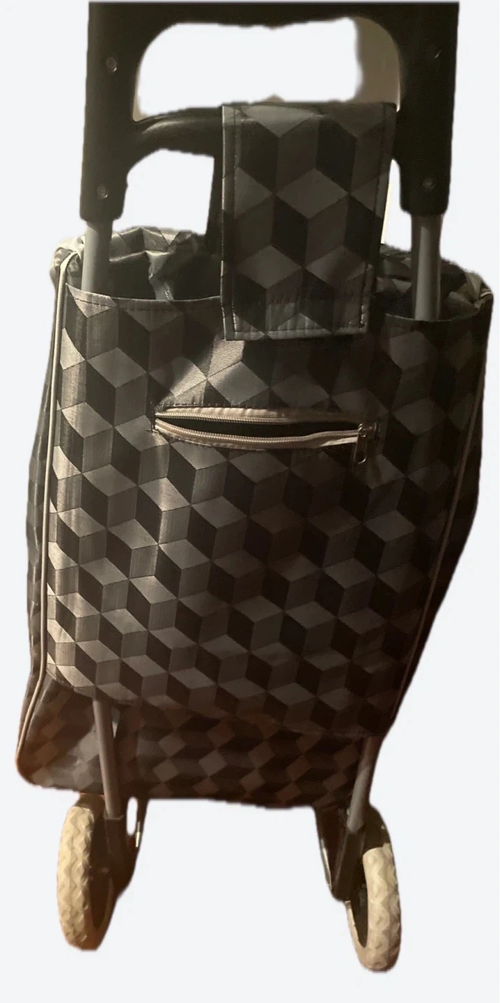 This is a shopping trolley bag with a cube pattern. It's made of fabric and has a sturdy handle. Perfect for carrying groceries or other items.