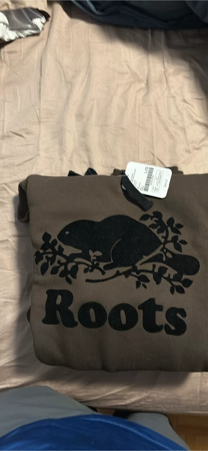 Classic Roots sweatshirt featuring the iconic beaver logo. It's a size large. This comfy top is made from a soft material perfect for casual wear.