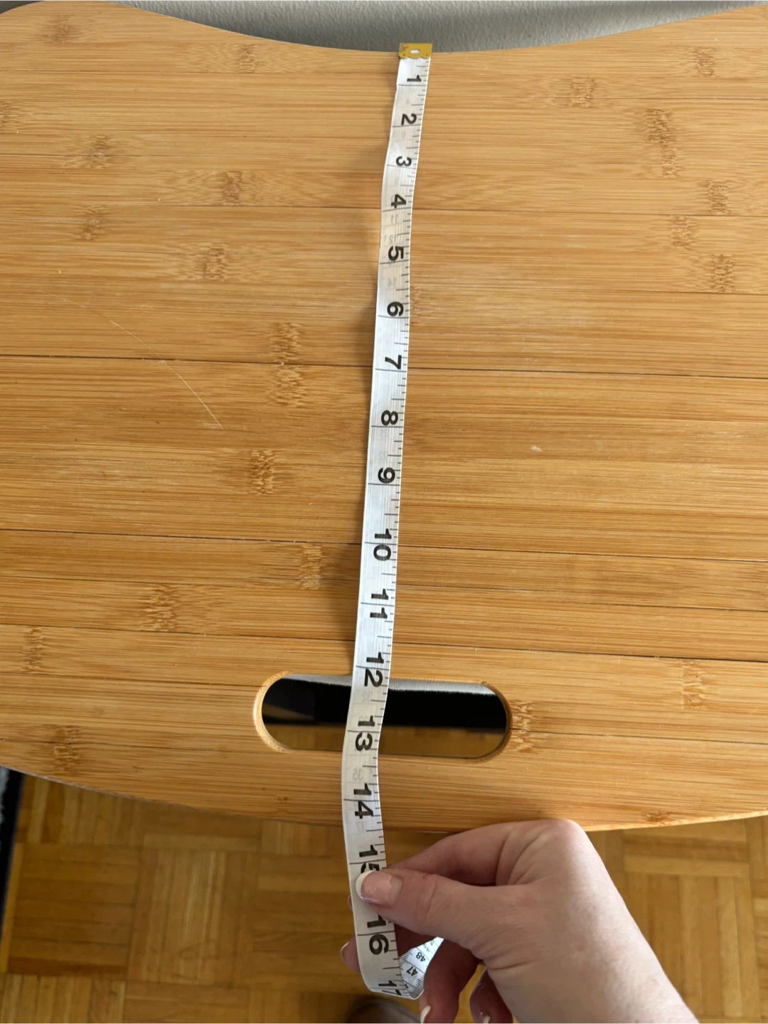 This bamboo lap bed desk is perfect for working or relaxing in bed! It's made of bamboo and has a convenient handle for carrying. It measures approximately 22 inches wide and 16 inches deep.