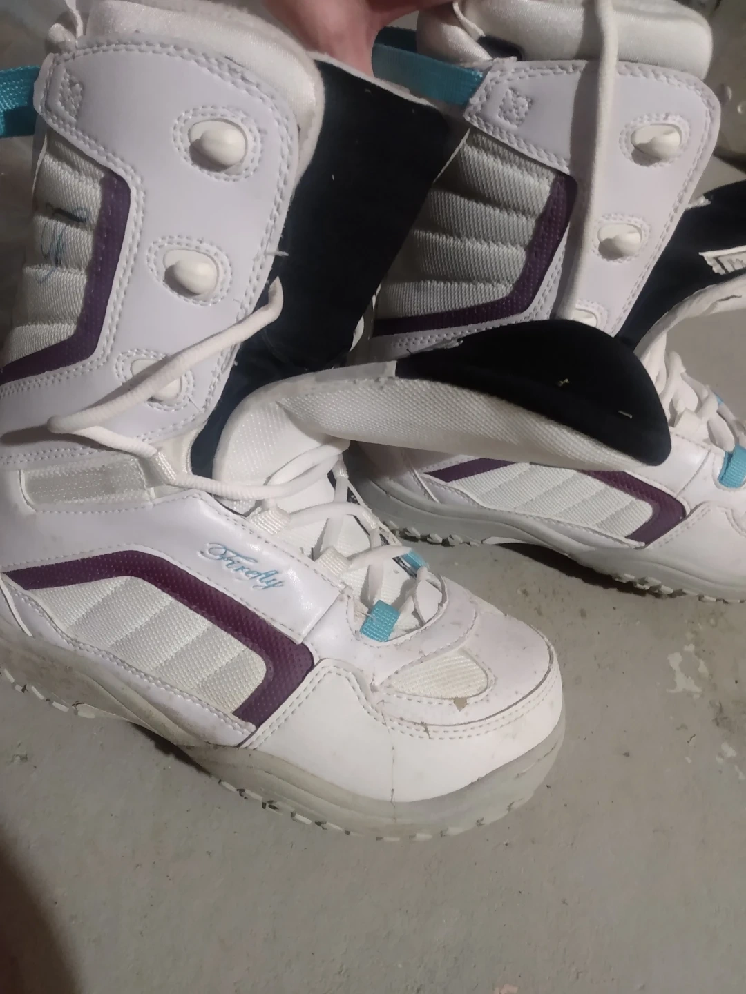 These Firefly snowboard boots are white with purple and teal accents. They feature a traditional lace-up closure system. Boots are a women's size 7. They're ready for hitting the slopes!