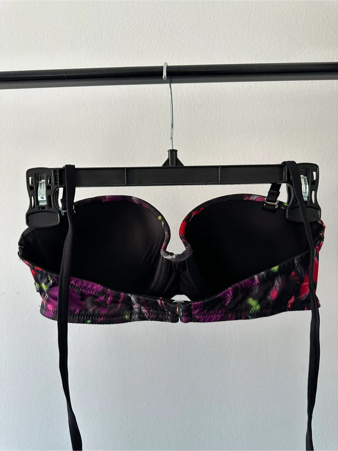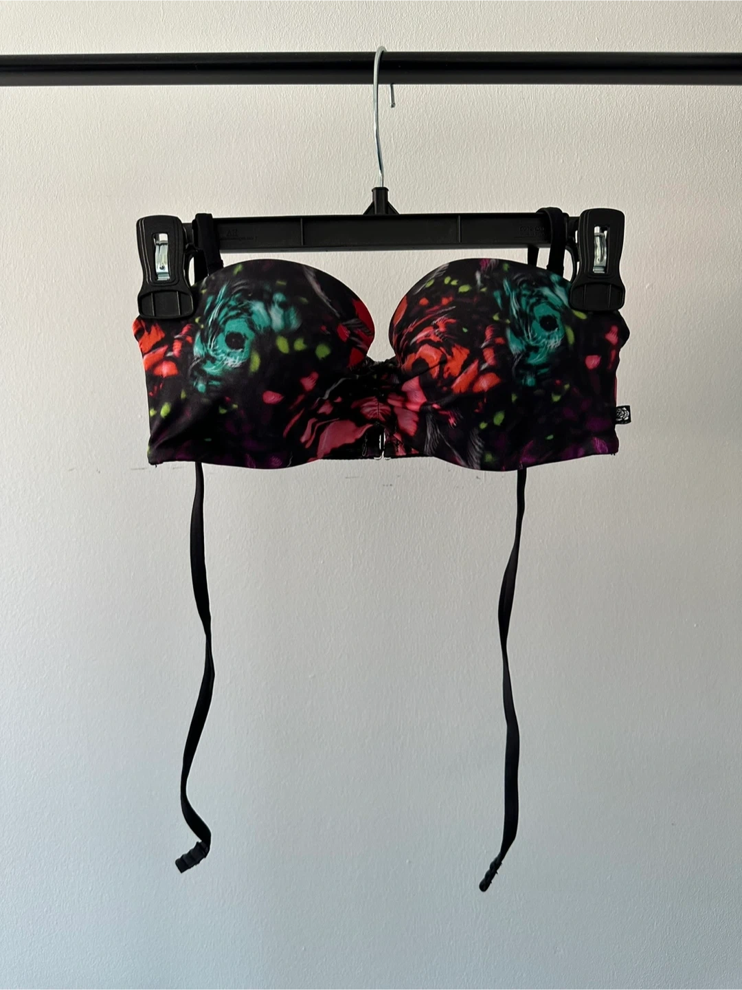 This strapless swim bra features a bold, colourful floral print on a black background. It has a front clasp closure and adjustable ties for a secure fit. The material is a polyester blend. Underbust measures 24 inches.