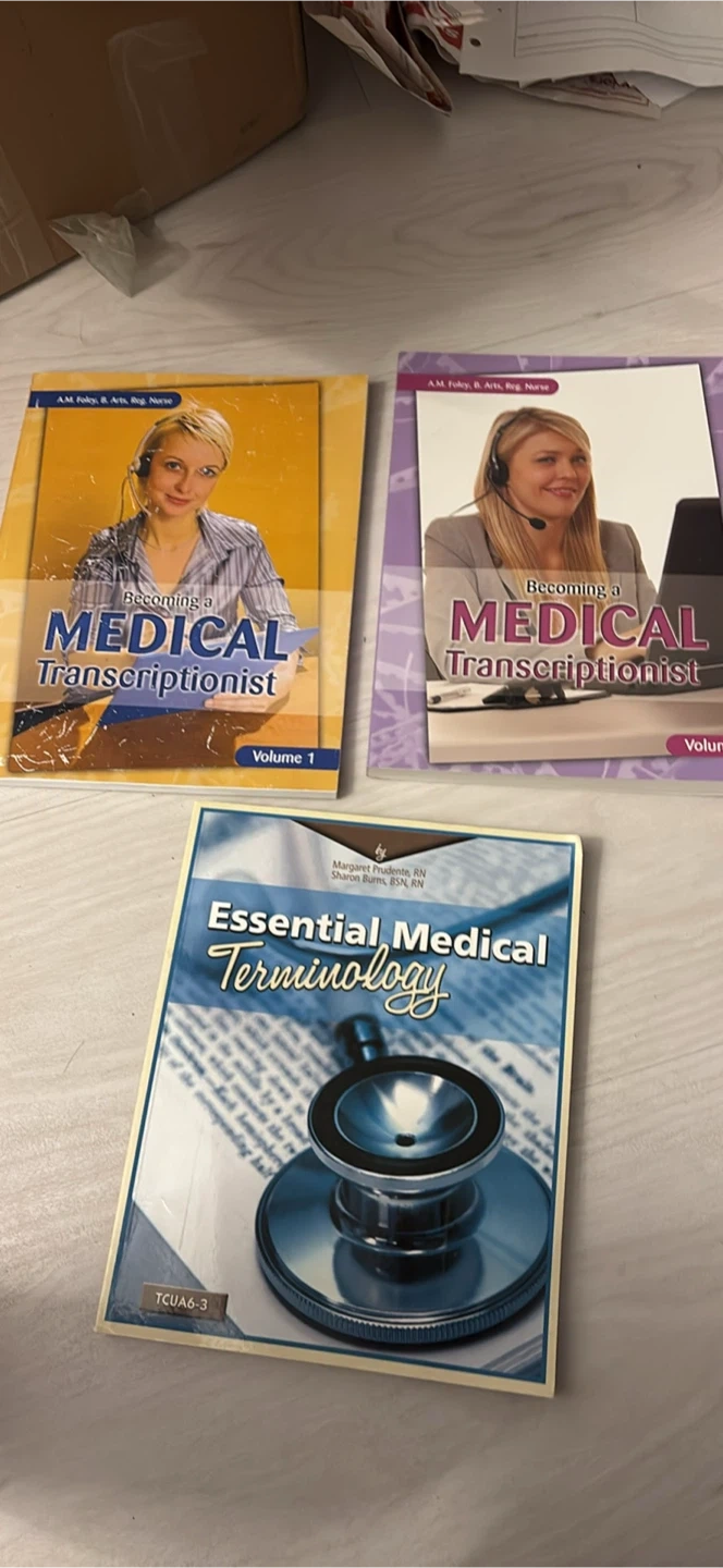 This set includes 'Becoming a Medical Transcriptionist Volume 1' and another copy of the same book, plus 'Essential Medical Terminology'. These books are designed for aspiring medical transcriptionists and students learning medical terms. Perfect for anyone starting a career in medical transcription or looking to brush up on their terminology knowledge! 40$ for all