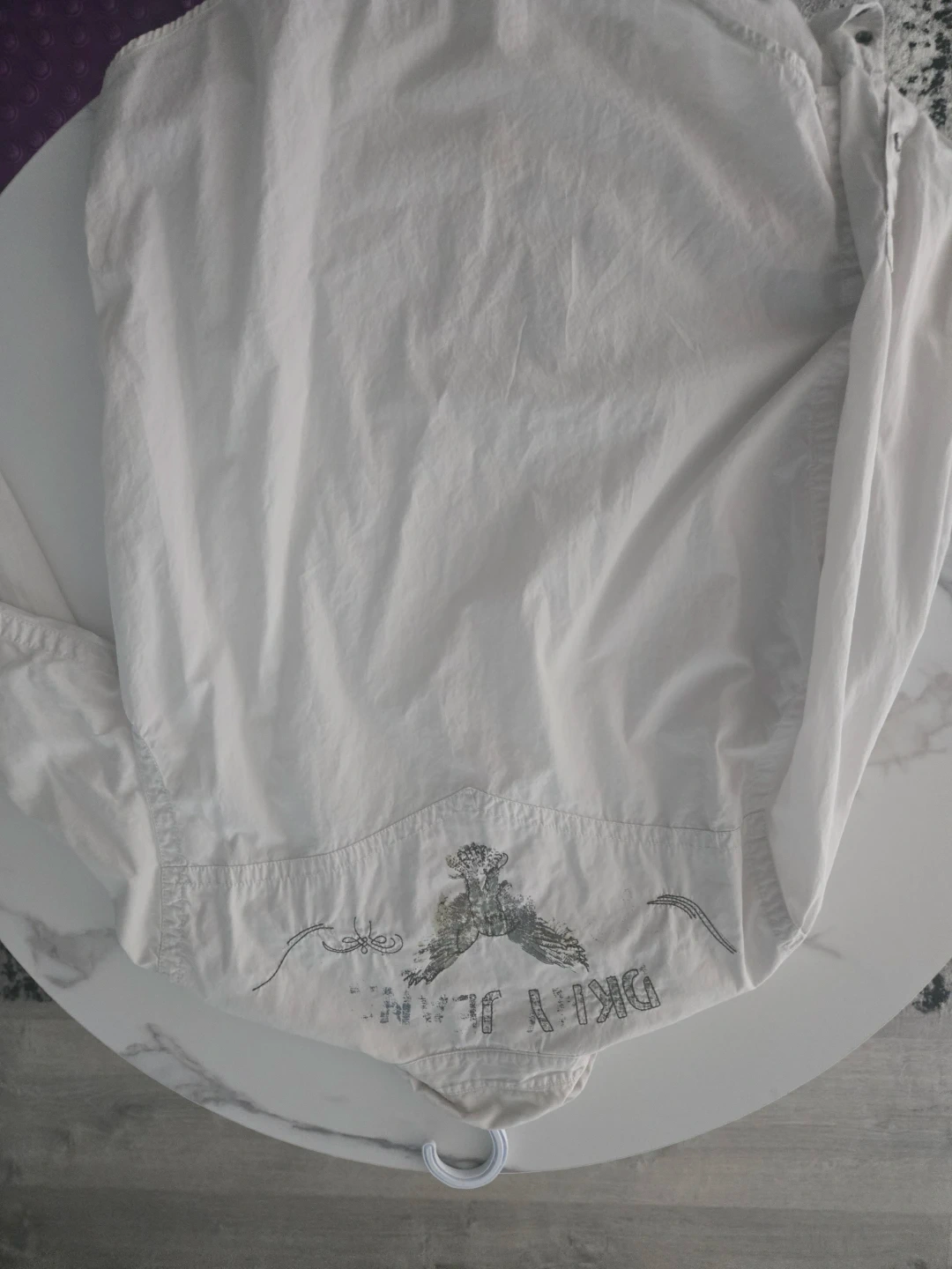 The size S A classic white button-up shirt from DKNY Jeans. It features a collared neckline and button cuffs. Made from a soft cotton blend.