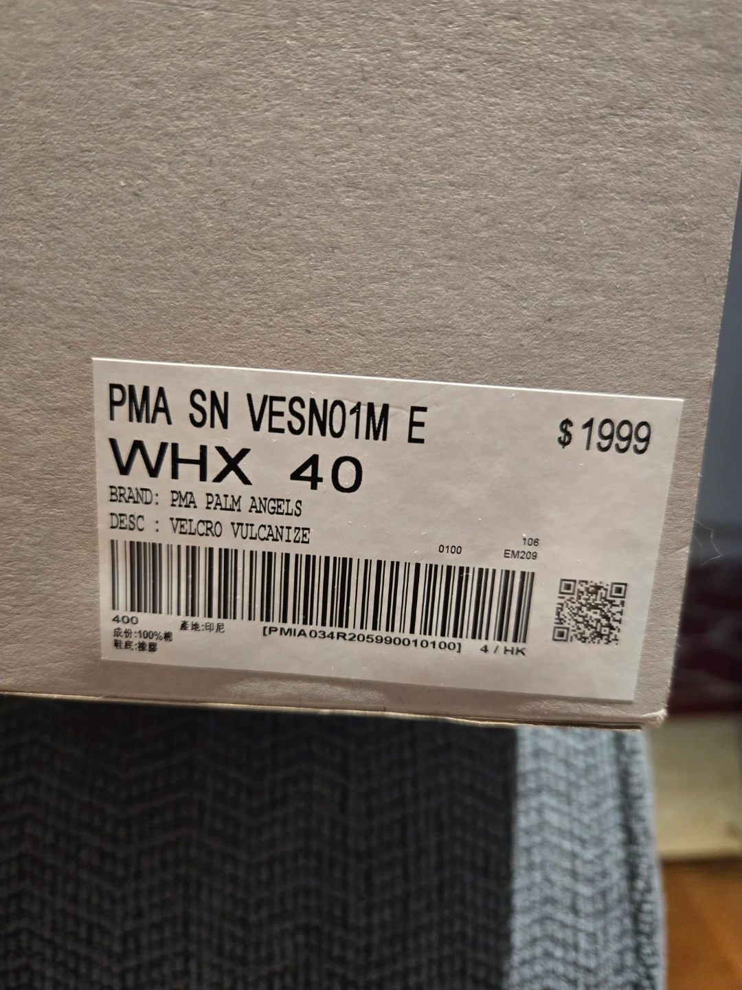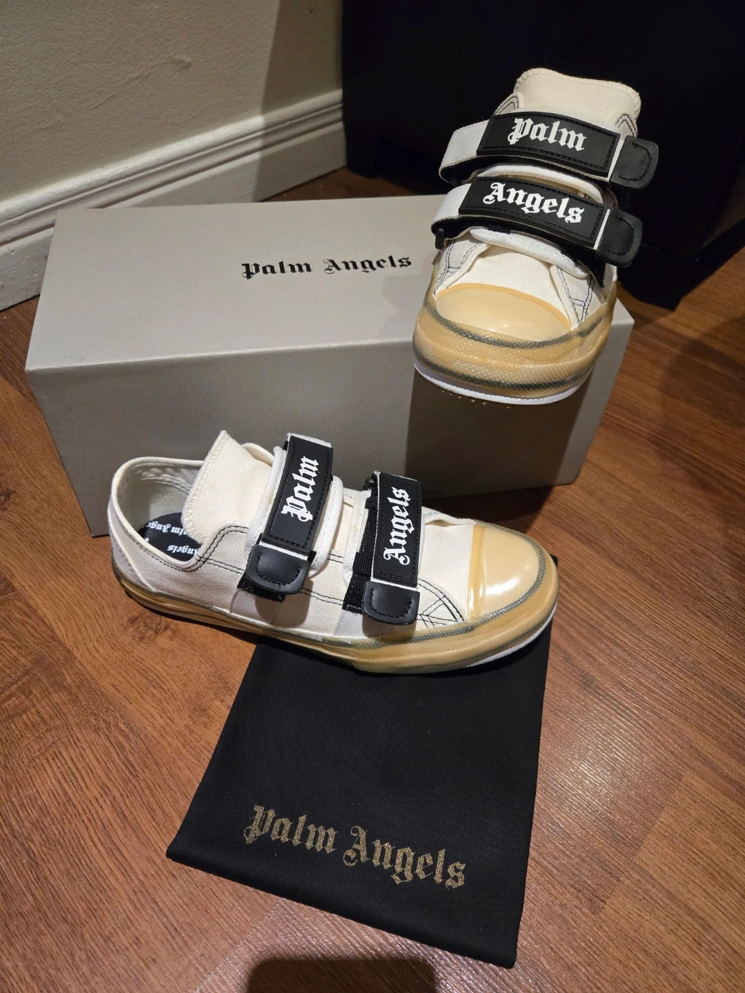 These Palm Angels sneakers come in white with black Velcro straps featuring the brand's logo. The box and dust bag are included. They're a size 40.