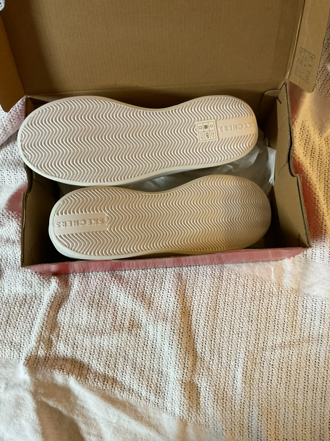 These white Skechers sneakers feature a blue trim detail. They're lace-up style and come with their original box. These are stylish everyday shoes.