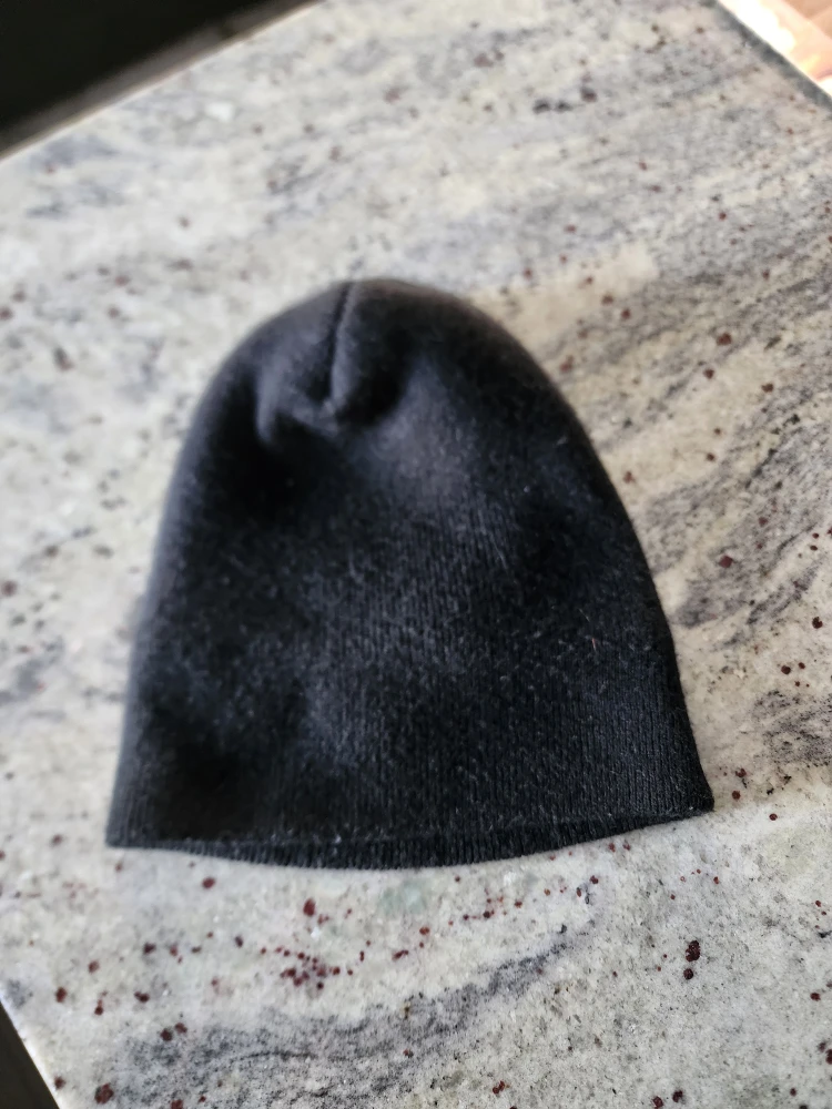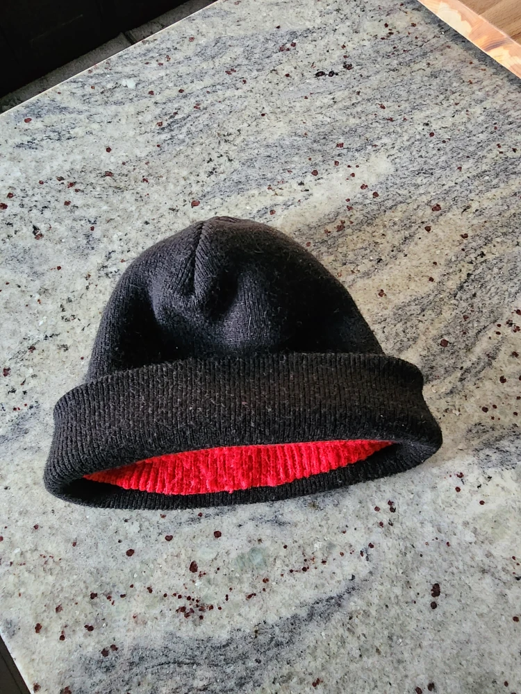 Selling a simple black beanie! It's in great condition and ready to keep you warm. The inside is a cool red colour!