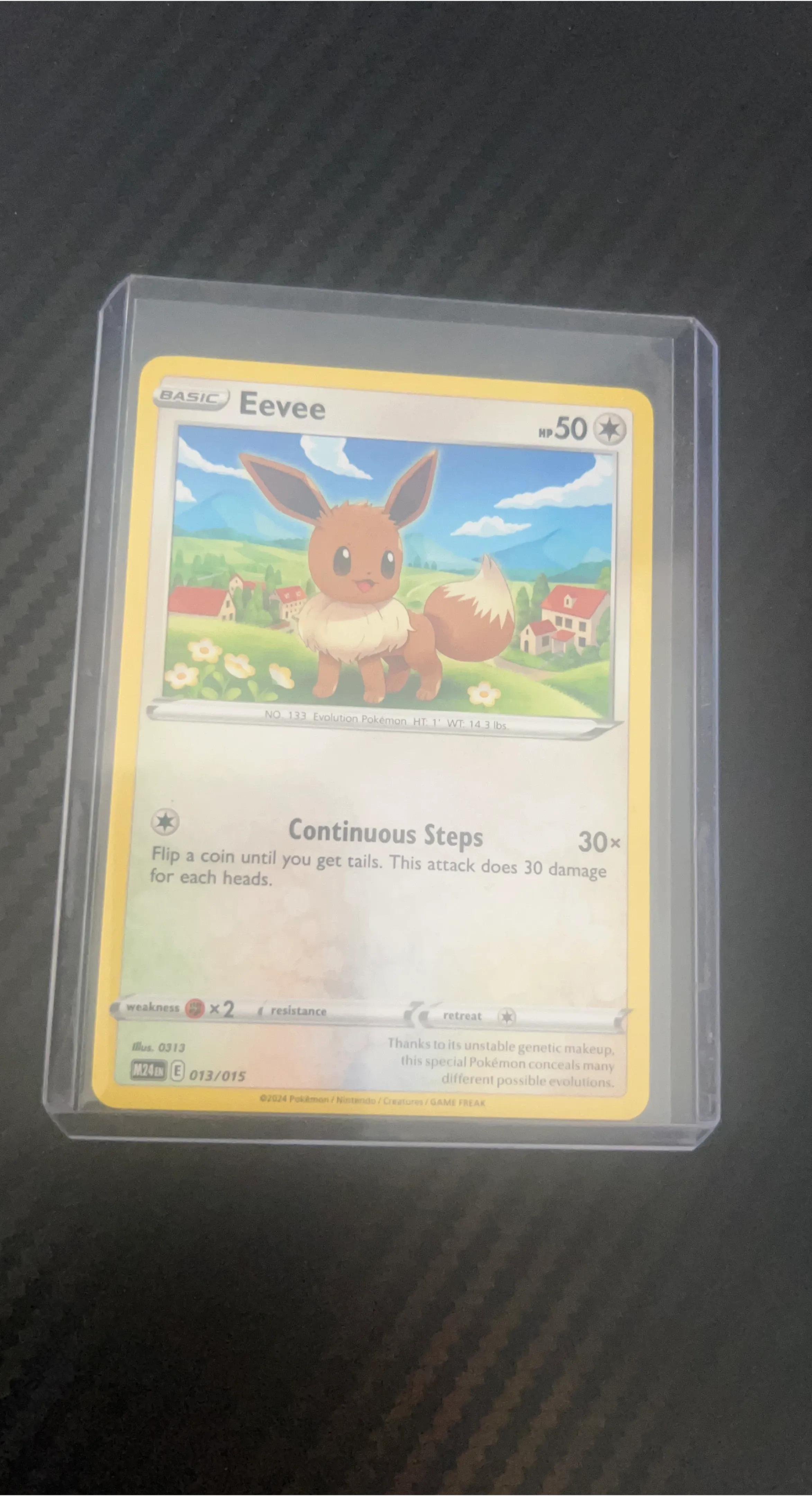 Selling an Eevee Pokemon card in new condition! It's a basic card with 50 HP. The card features the Continuous Steps attack. It is card number 013/015.