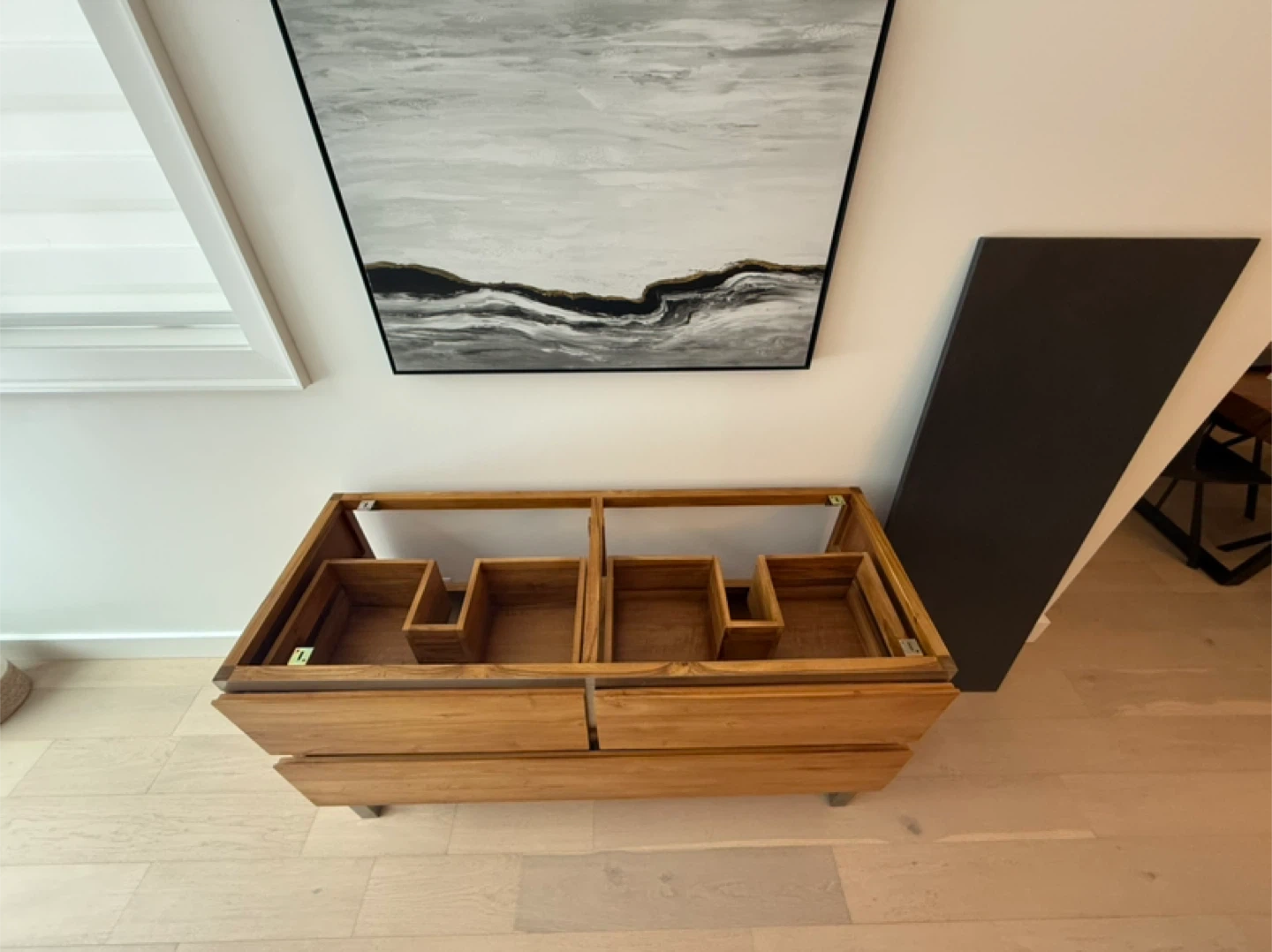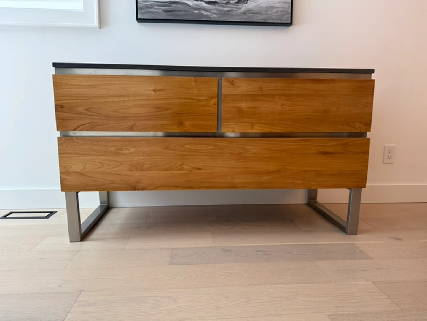 Solid wood vanity/ storage cabinet with a modern dark grey countertop and a brushed stainless steel frame. It features three sets of drawers for ample storage. This piece would be great for a bathroom renovation. Originally purchased from Montreal and shipped to Toronto.