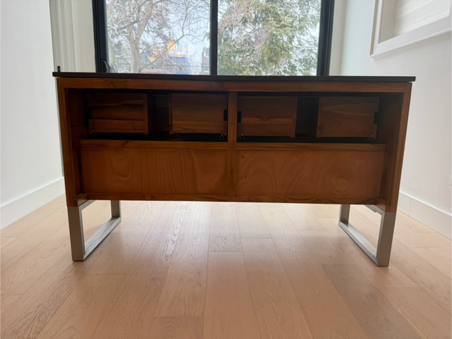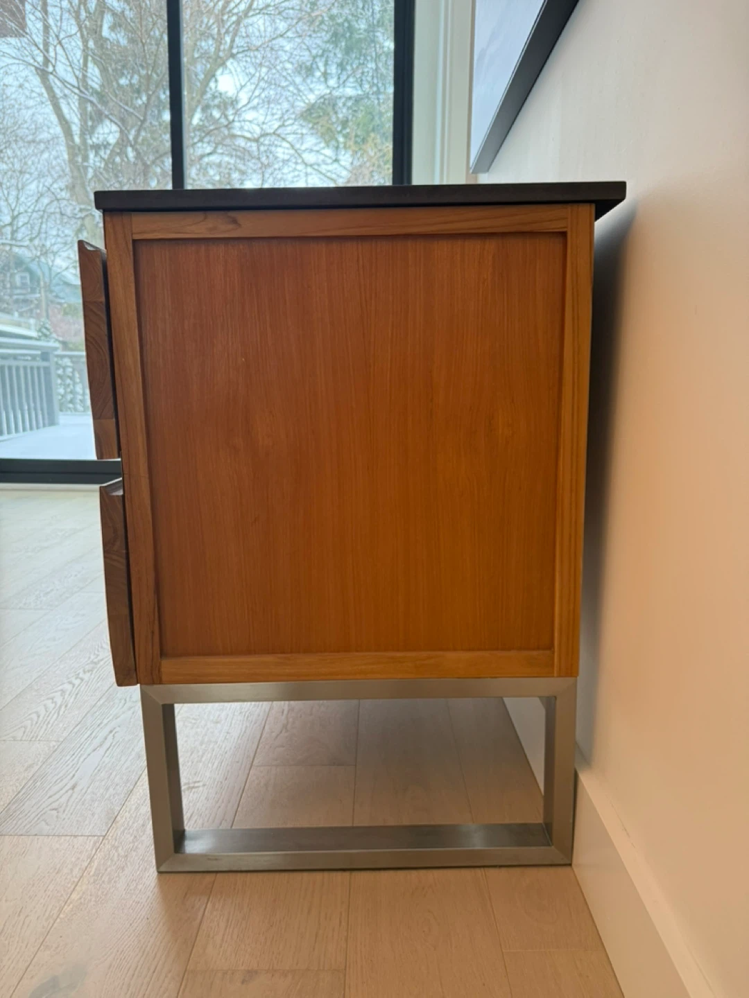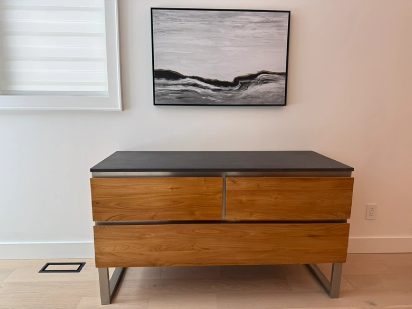 Solid wood vanity/ storage cabinet with a modern dark grey countertop and a brushed stainless steel frame. It features three sets of drawers for ample storage. This piece would be great for a bathroom renovation. Originally purchased from Montreal and shipped to Toronto.