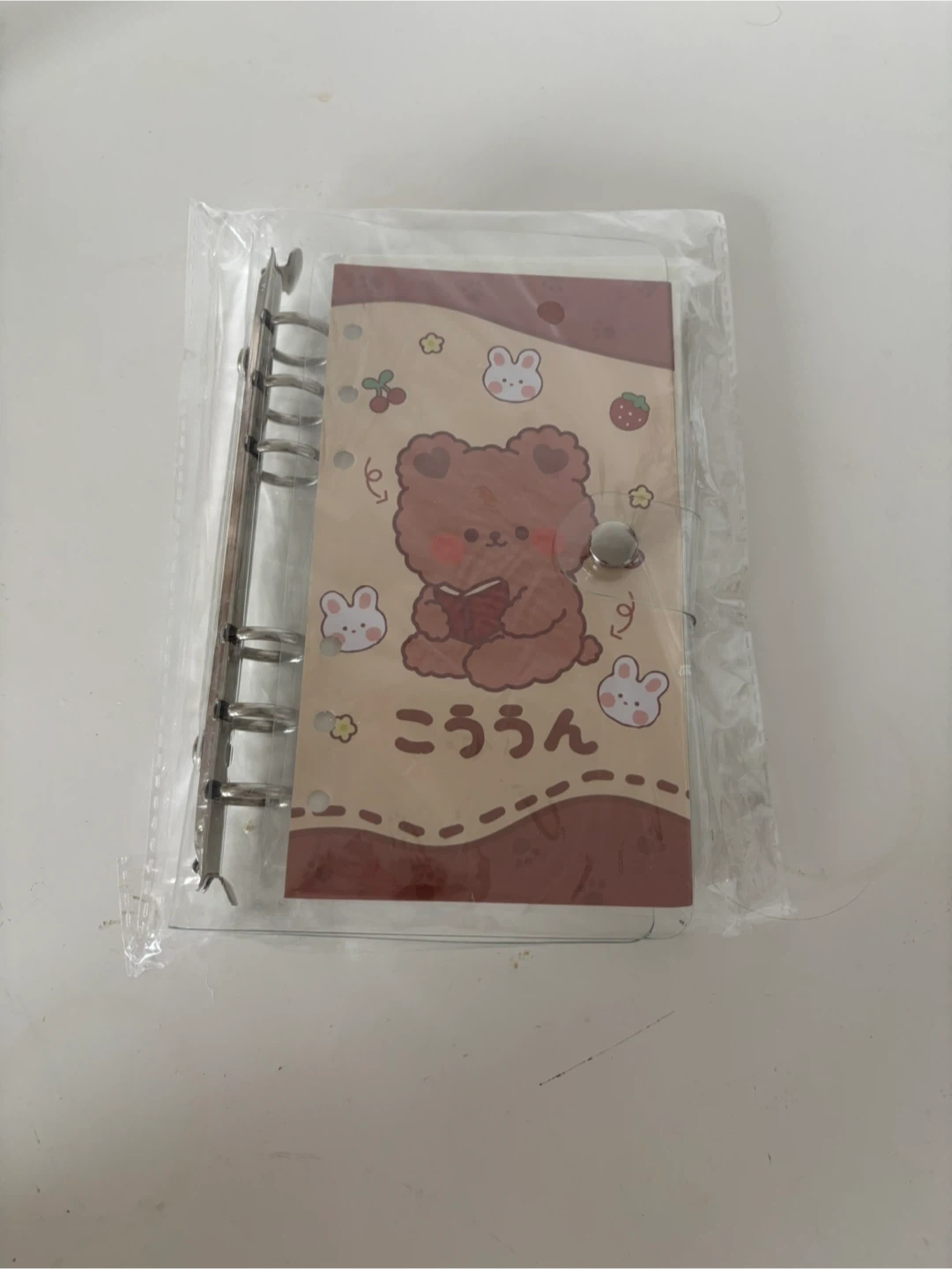This is a cute binder notebook featuring a kawaii bear design. It has a 6-ring binder mechanism for easy page adding or removal. Perfect for journaling or note-taking!
