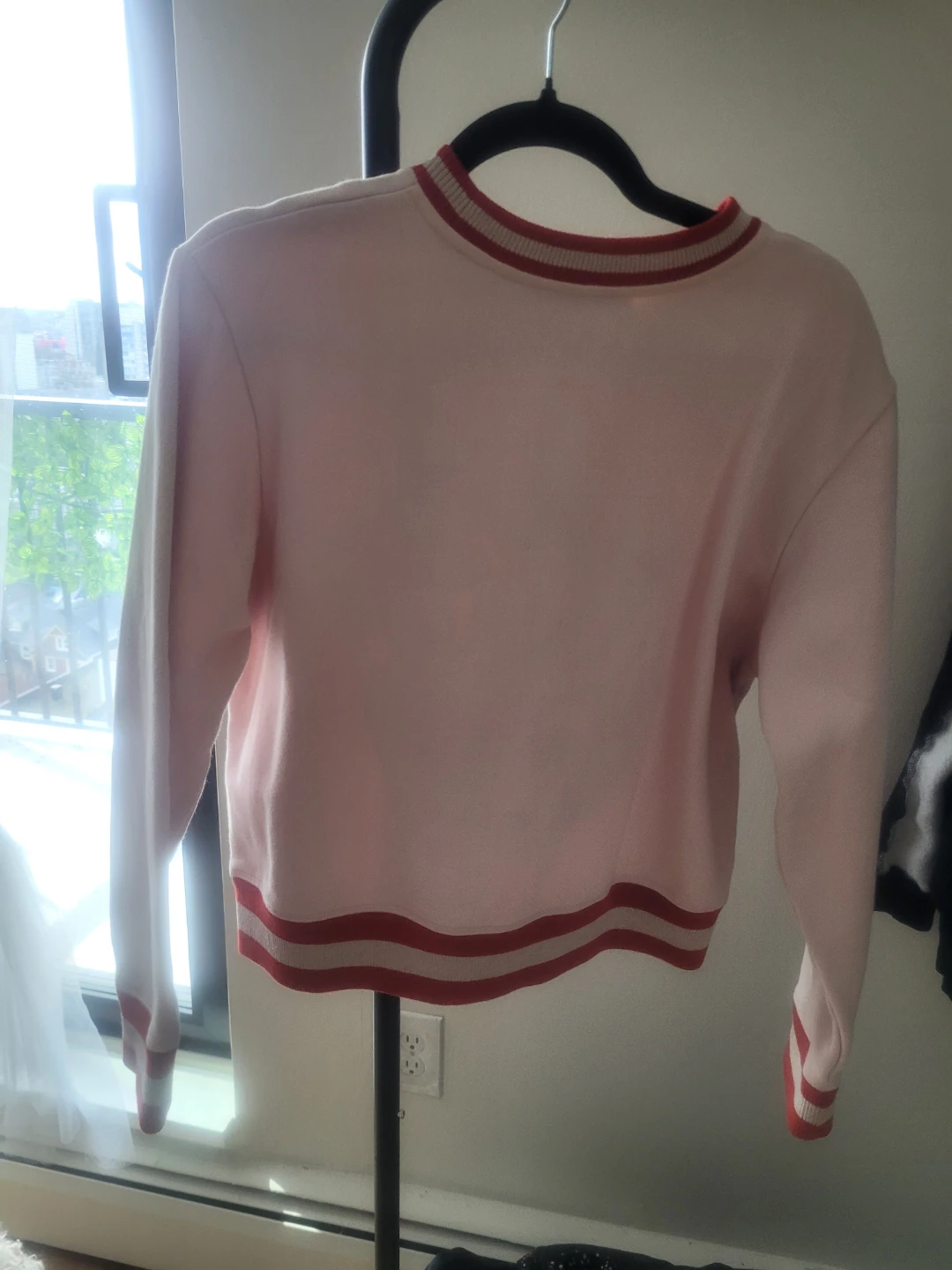 Pink sweatshirt from Sandro Paris with a colourful embroidered phoenix and floral design on the front. Features ribbed cuffs and neckline with red and gold stripes. Crew neck, long sleeves. Brand new without tags. It can fit either a small or medium.