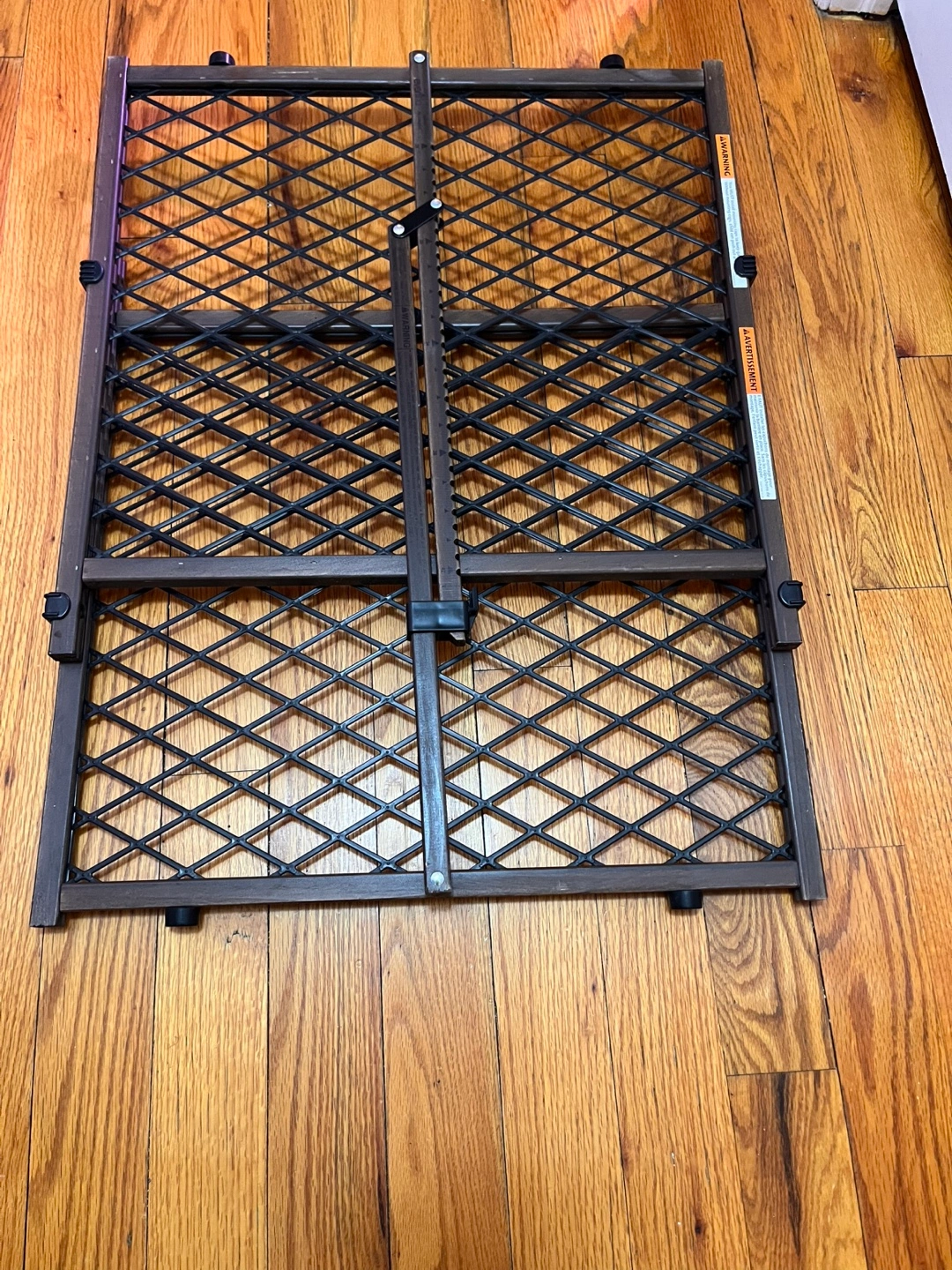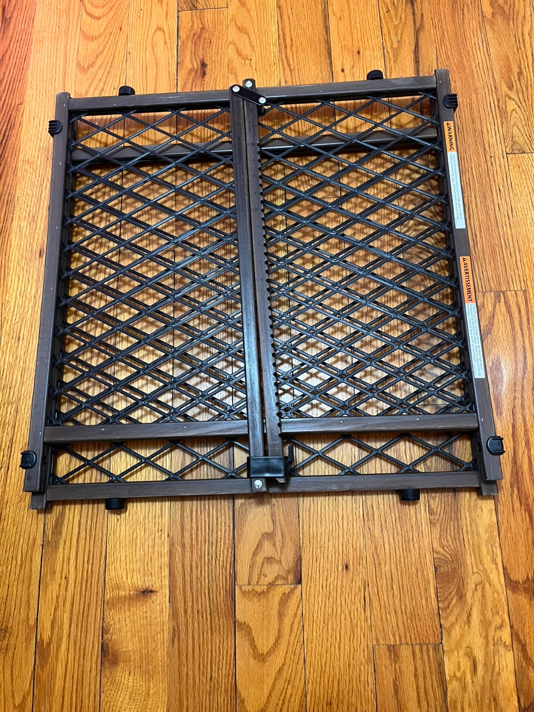 Brown retractable pet gate. Easy to install and use. Great for doorways and hallways. Can also be used for children. Durable and safe.