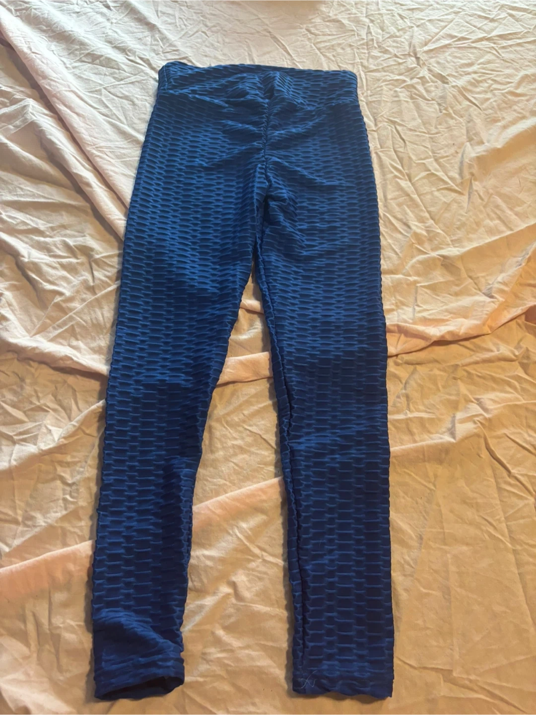 Selling a pair of blue leggings with a unique textured pattern! They look great and are super comfy. Perfect for workouts or just lounging around the house