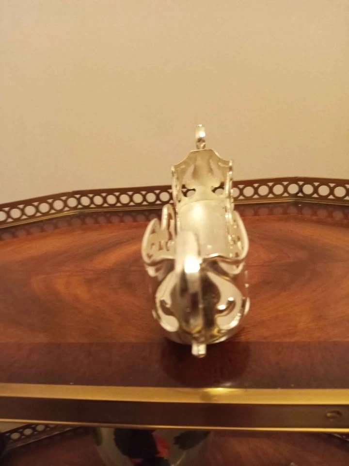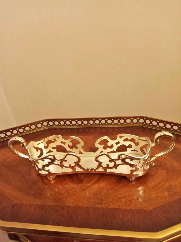 Made from high quality silver plate with intricate openwork, standing on small feet. It has a handle and can also be used as a decorative napkin or letter holder. It's solid and heavy. Dimensions are 9 1/2" x 3".