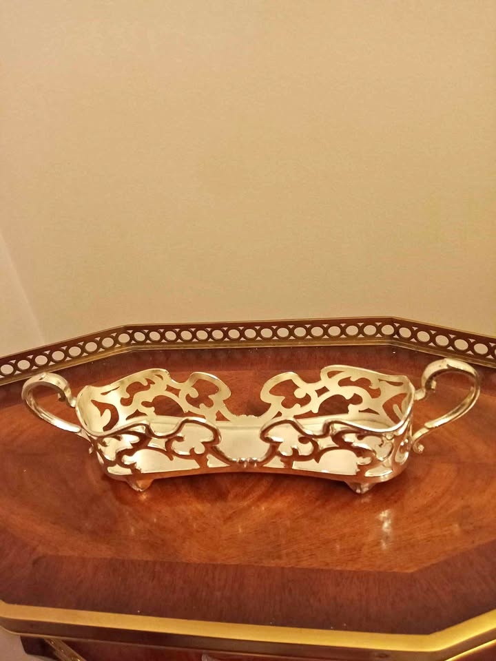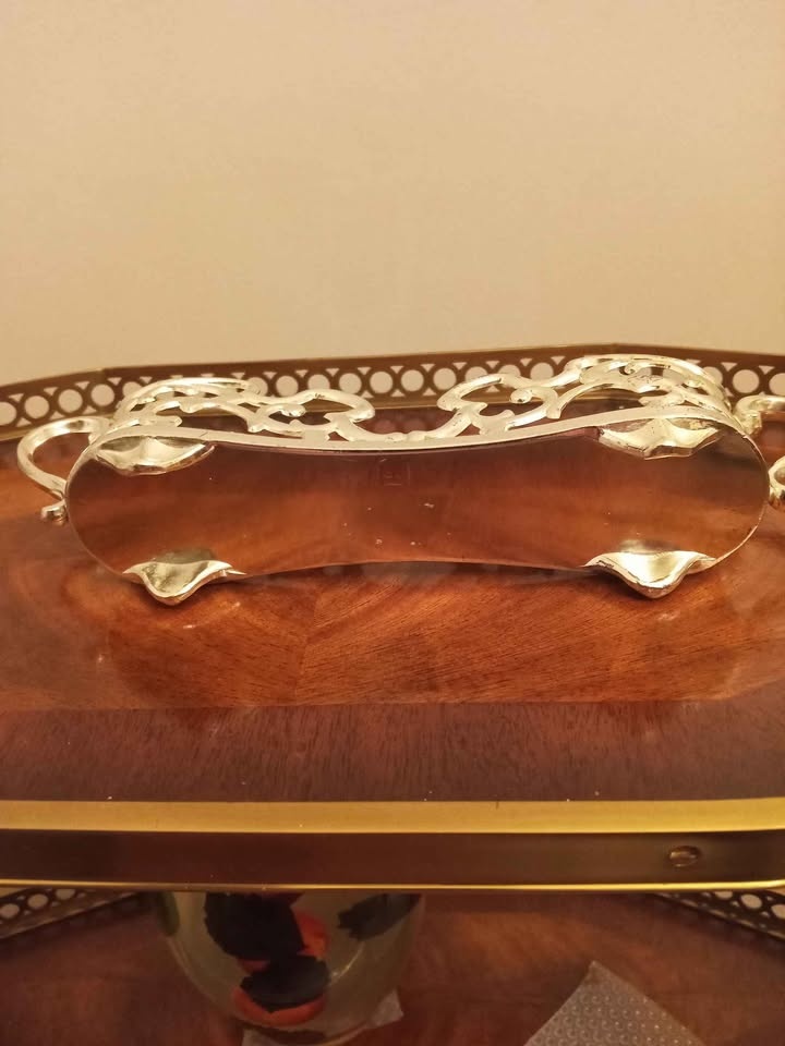 Made from high quality silver plate with intricate openwork, standing on small feet. It has a handle and can also be used as a decorative napkin or letter holder. It's solid and heavy. Dimensions are 9 1/2" x 3".