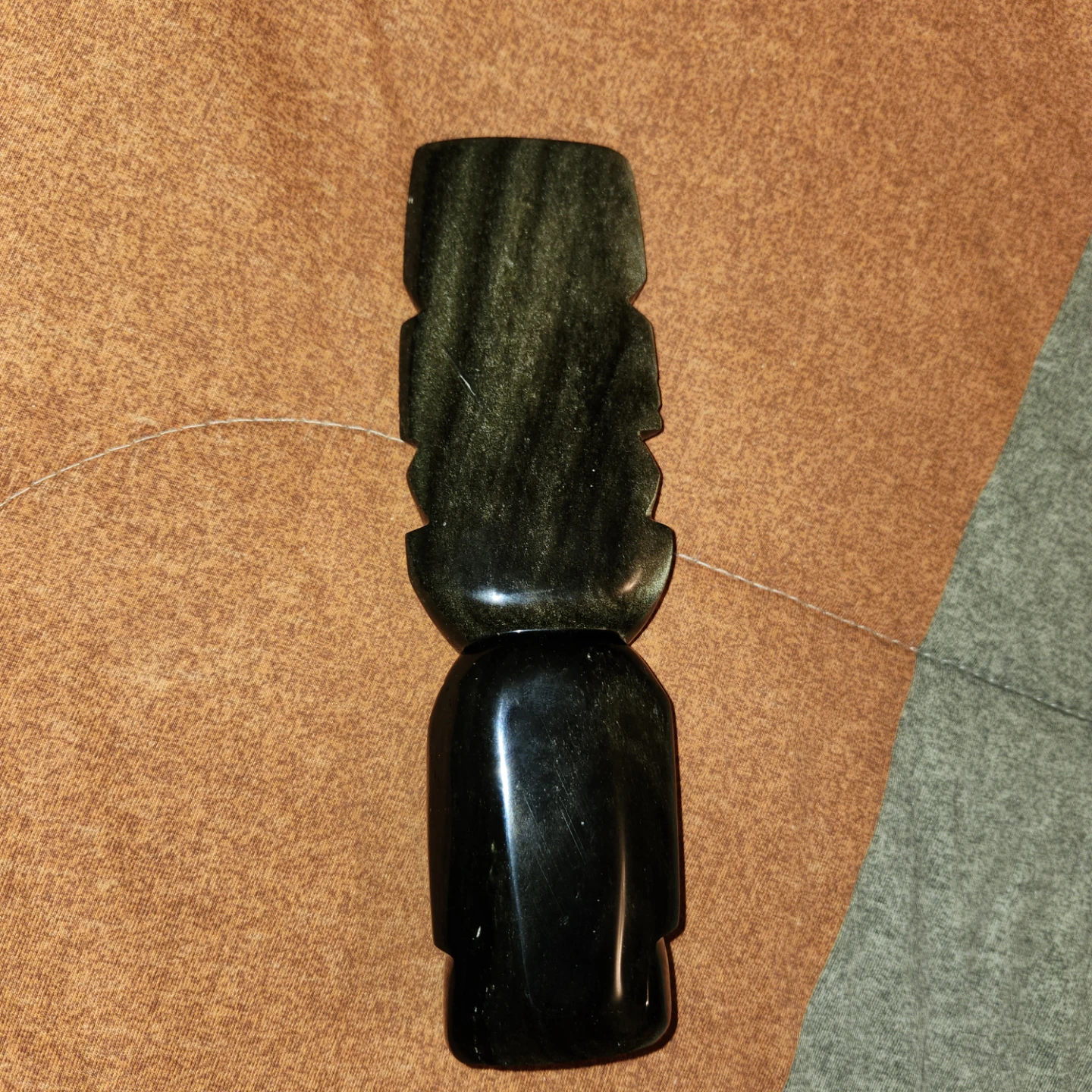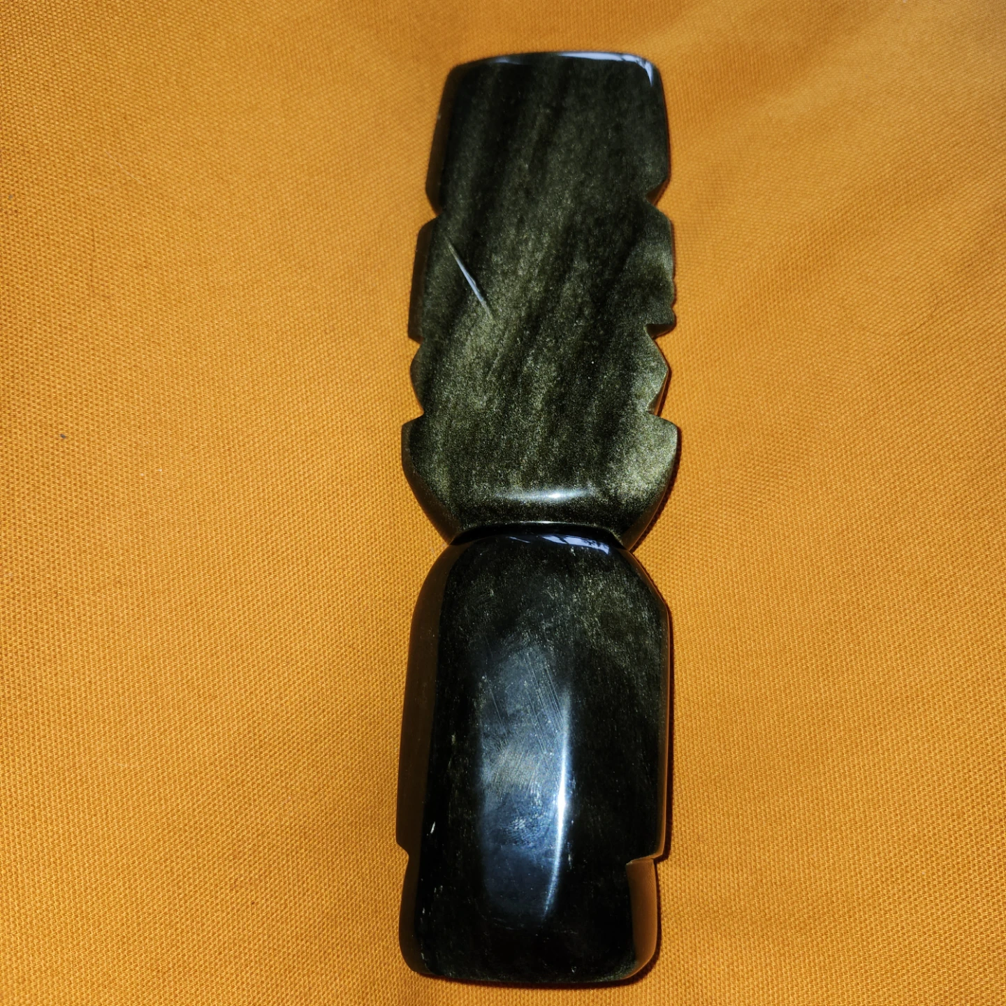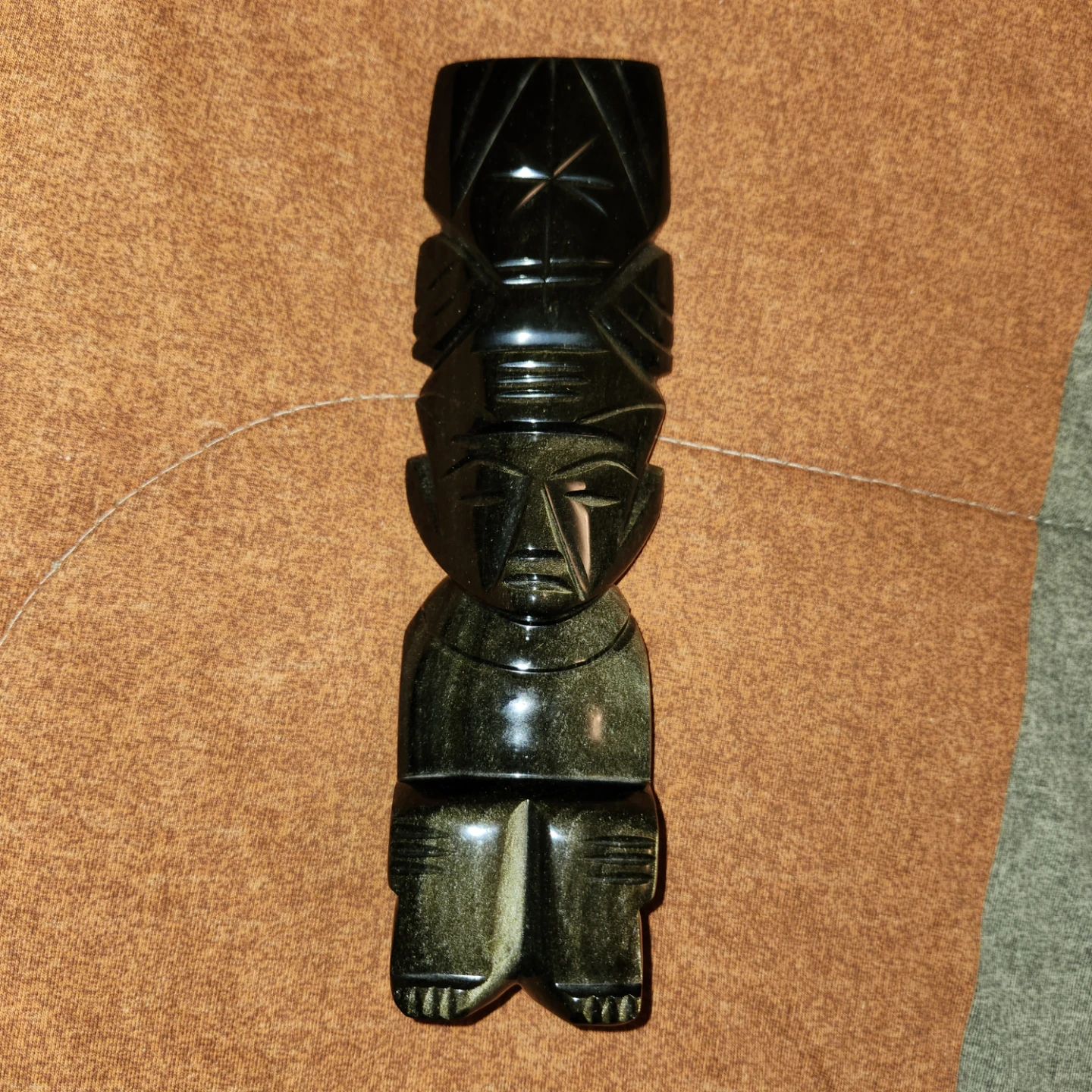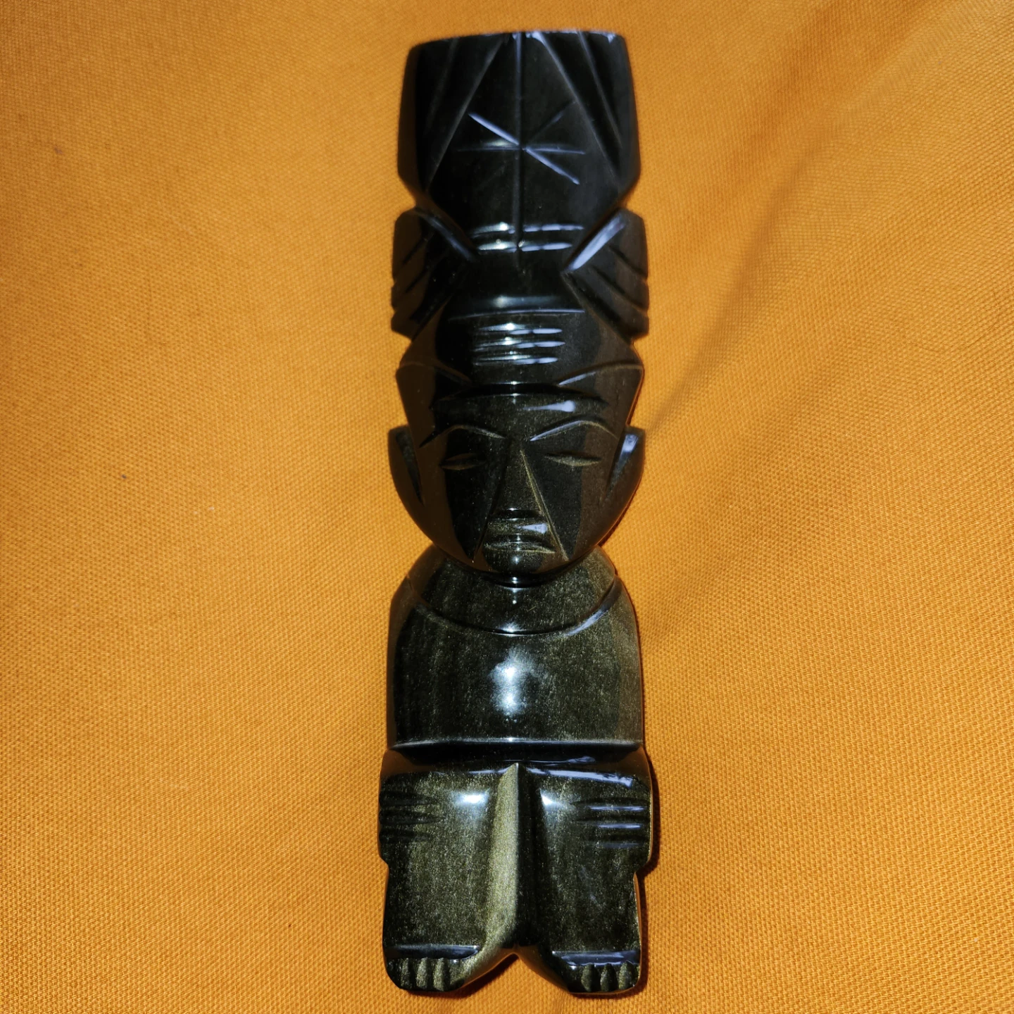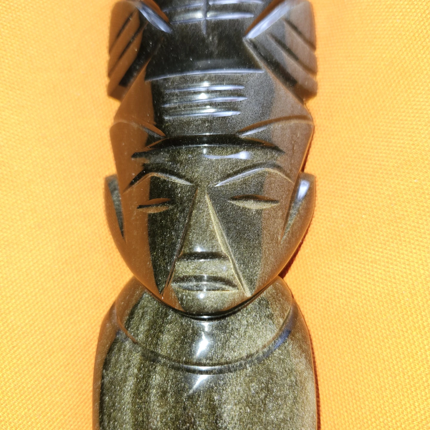 This is a carved figurine made from golden obsidian. It depicts a person with intricate carvings on the head and body. Beautiful, natural swirls within the stone are visible. 8 inches tall. Cash only.