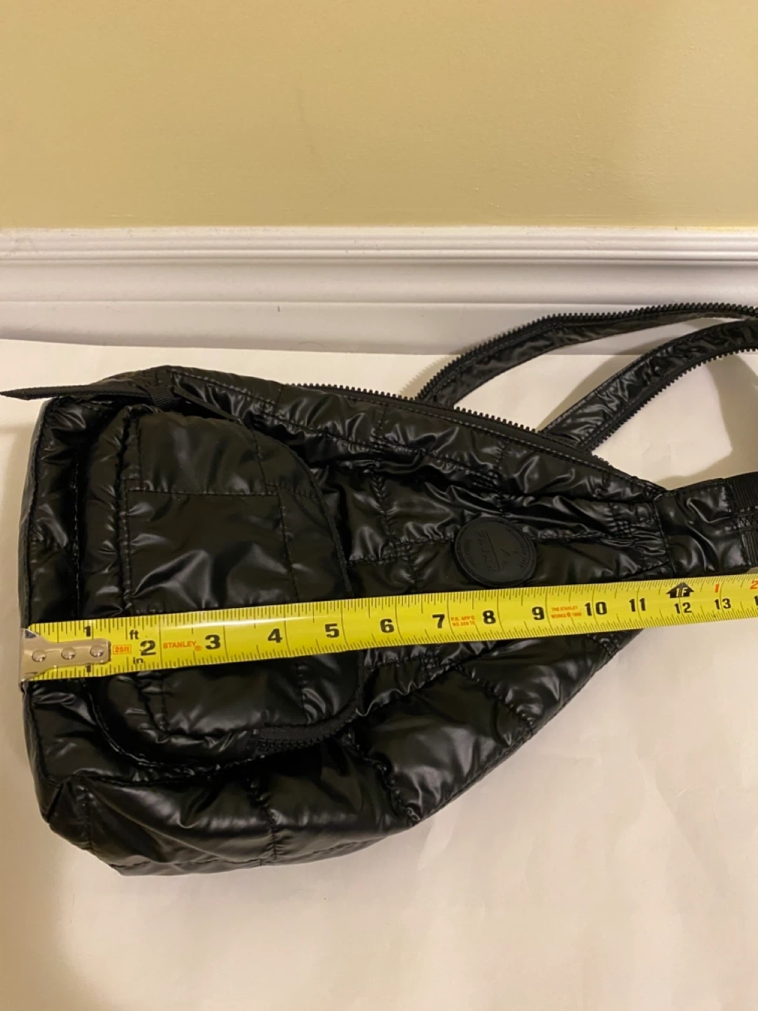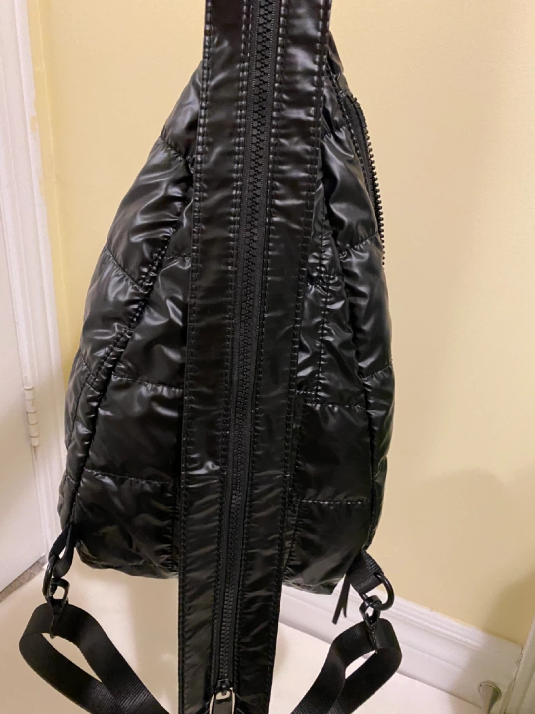 Pajar quilted black sling bag. Shiny nylon material with a front zippered pocket. It has adjustable straps for comfort.
