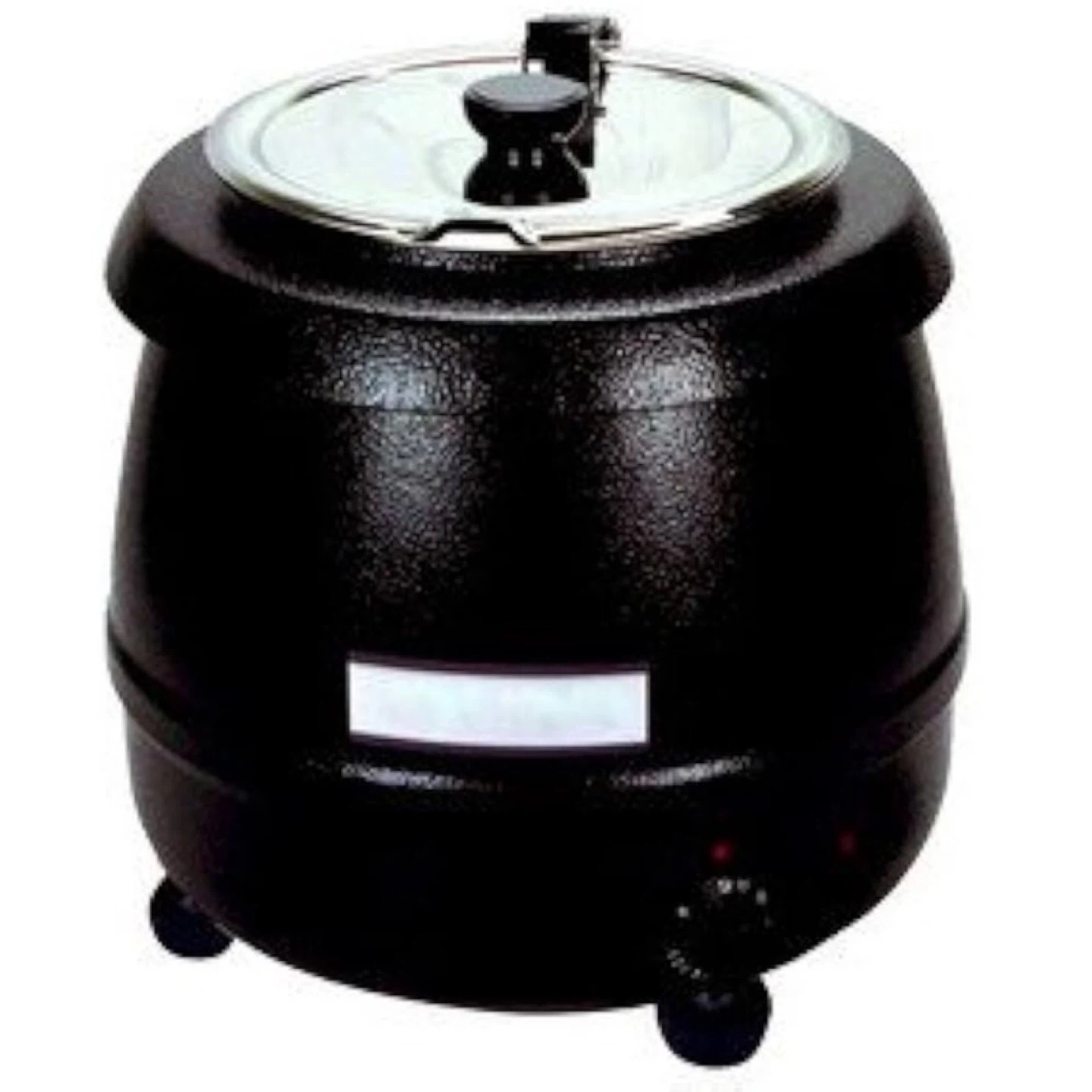 This is a brand new Eurodib electric soup kettle, model SB6000. It's black and comes with a stainless steel lid. This kettle is perfect for keeping soups and other liquids warm.