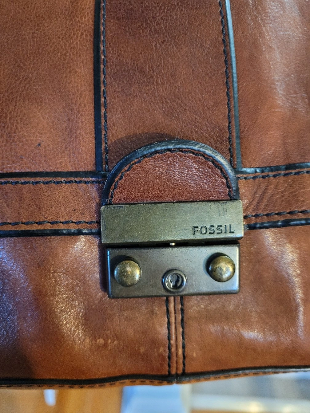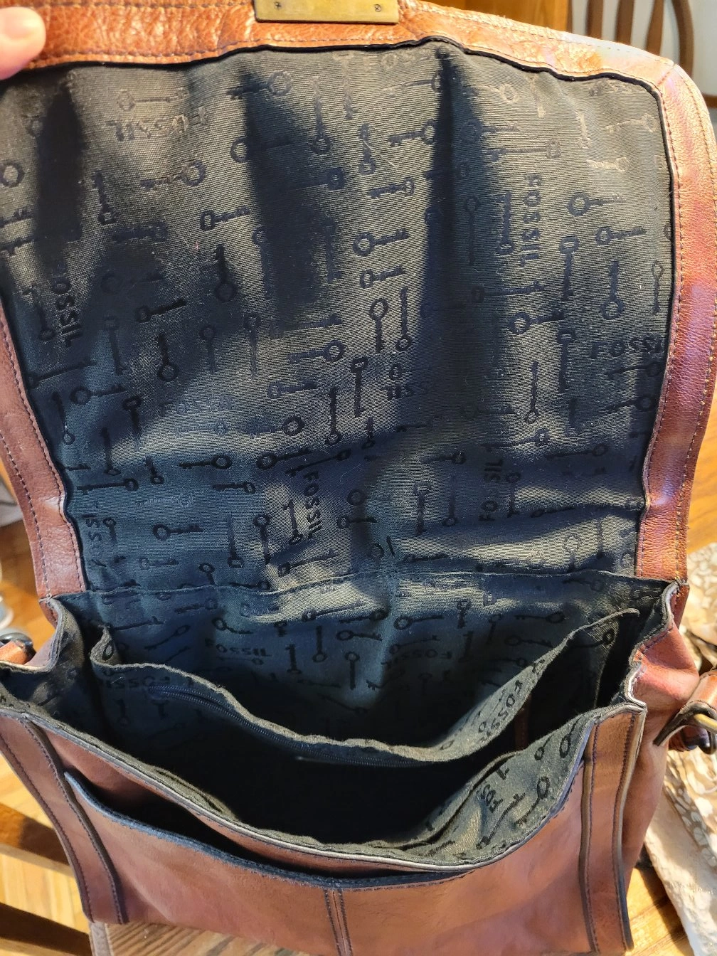 A beautiful brown leather crossbody bag from Fossil! It's in great condition and has a stylish, classic look. Perfect for everyday use or a night out. The interior lining features a fun key pattern.