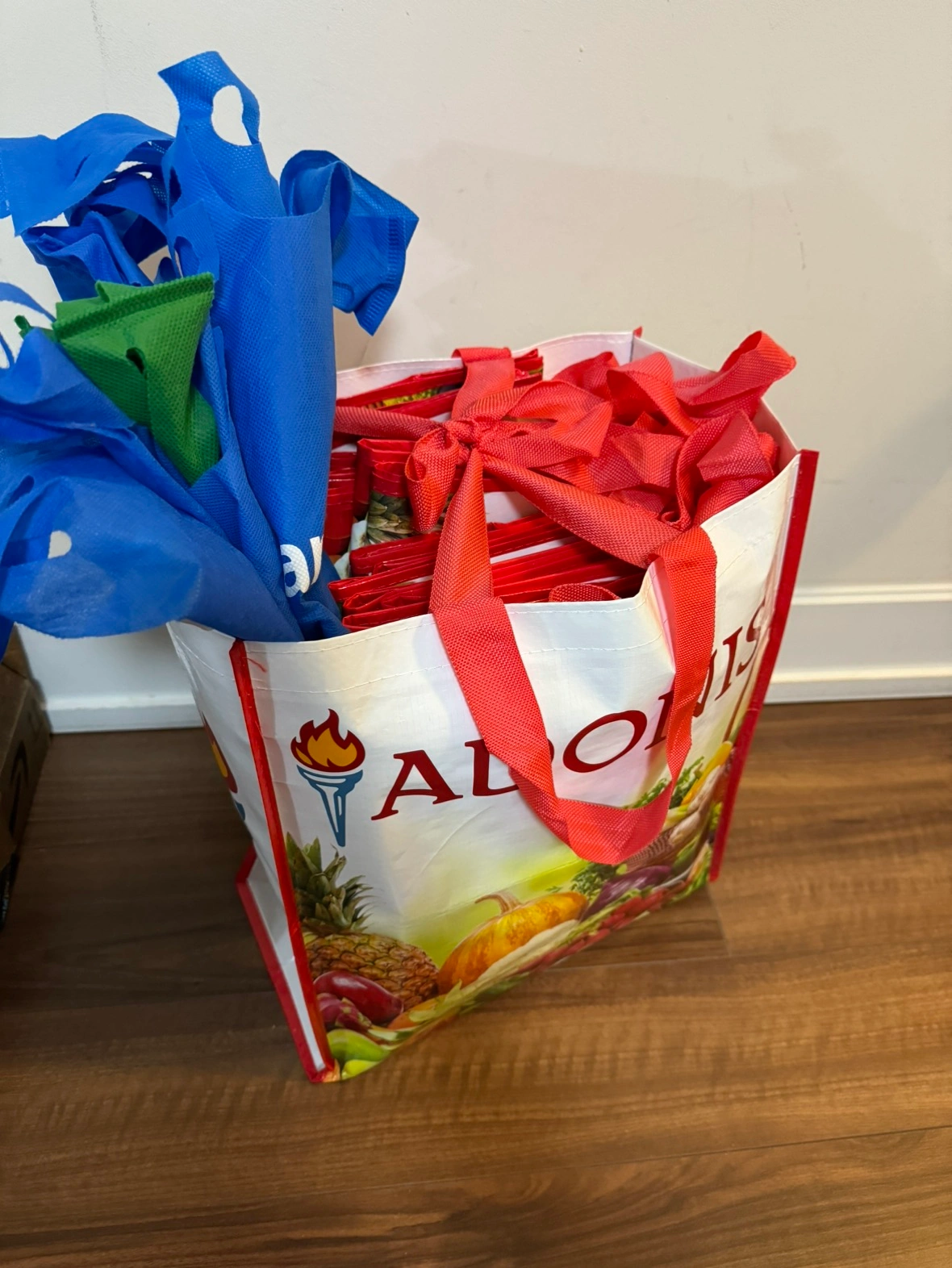 Over 30 reusable bags both big and medium size, I have so many as I use groceries delivery services, they’re all in good condition, literally only used once each.
