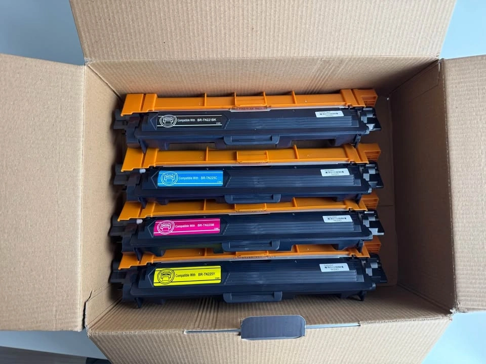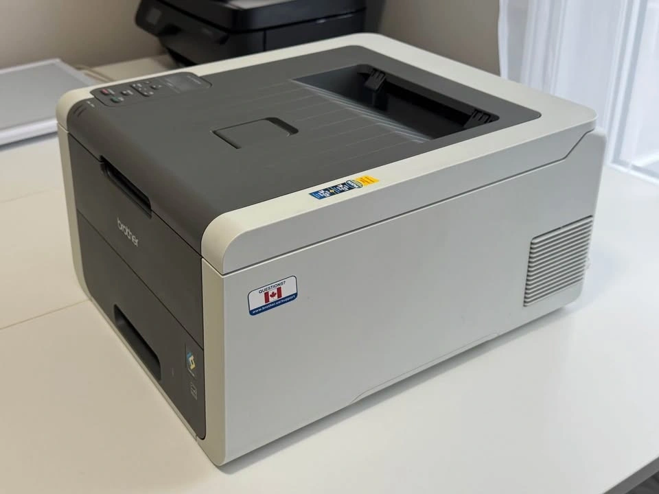 Brother HL-3140CW color laser printer with built-in Wi-Fi. Prints color and black and white from the paper tray or manual feed. Comes with used toner cartridges plus an extra set of brand new cartridges (cyan, magenta, yellow, and black).