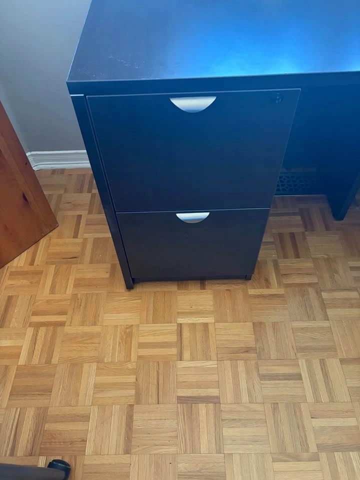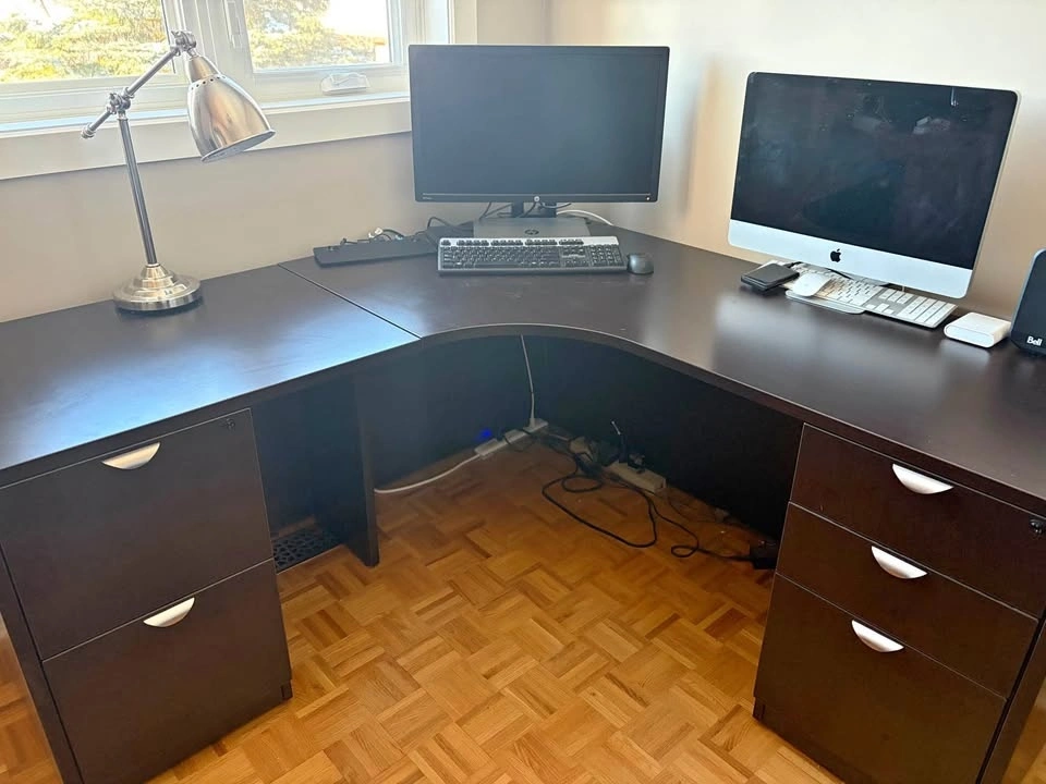 L-shaped office desk with two sides, each approximately 67" long. One side has two drawers and a file hanging space. The other side also has two drawers for hanging files. The cabinet is approximately 36" wide, 22" deep, and 30" high with a single shelf inside. Both desk drawers and the cabinet are lockable. The desk has been partially disassembled for easier moving, and all original hardware and assembly instructions are included. You will need a truck or van to transport this. I'm happy to help you load it up.