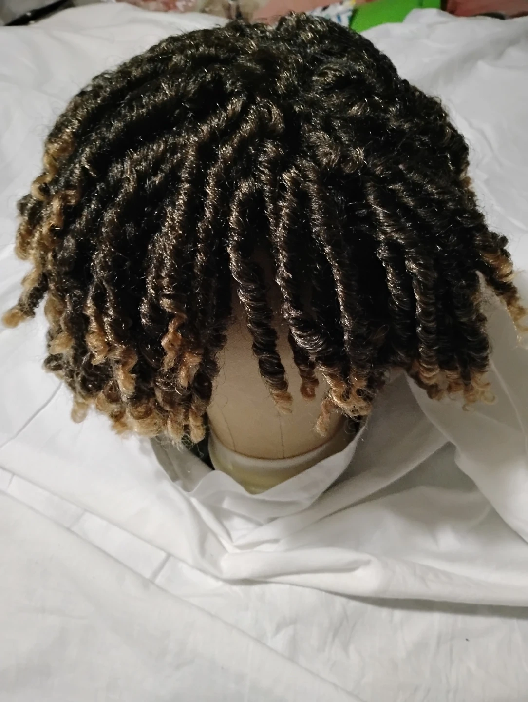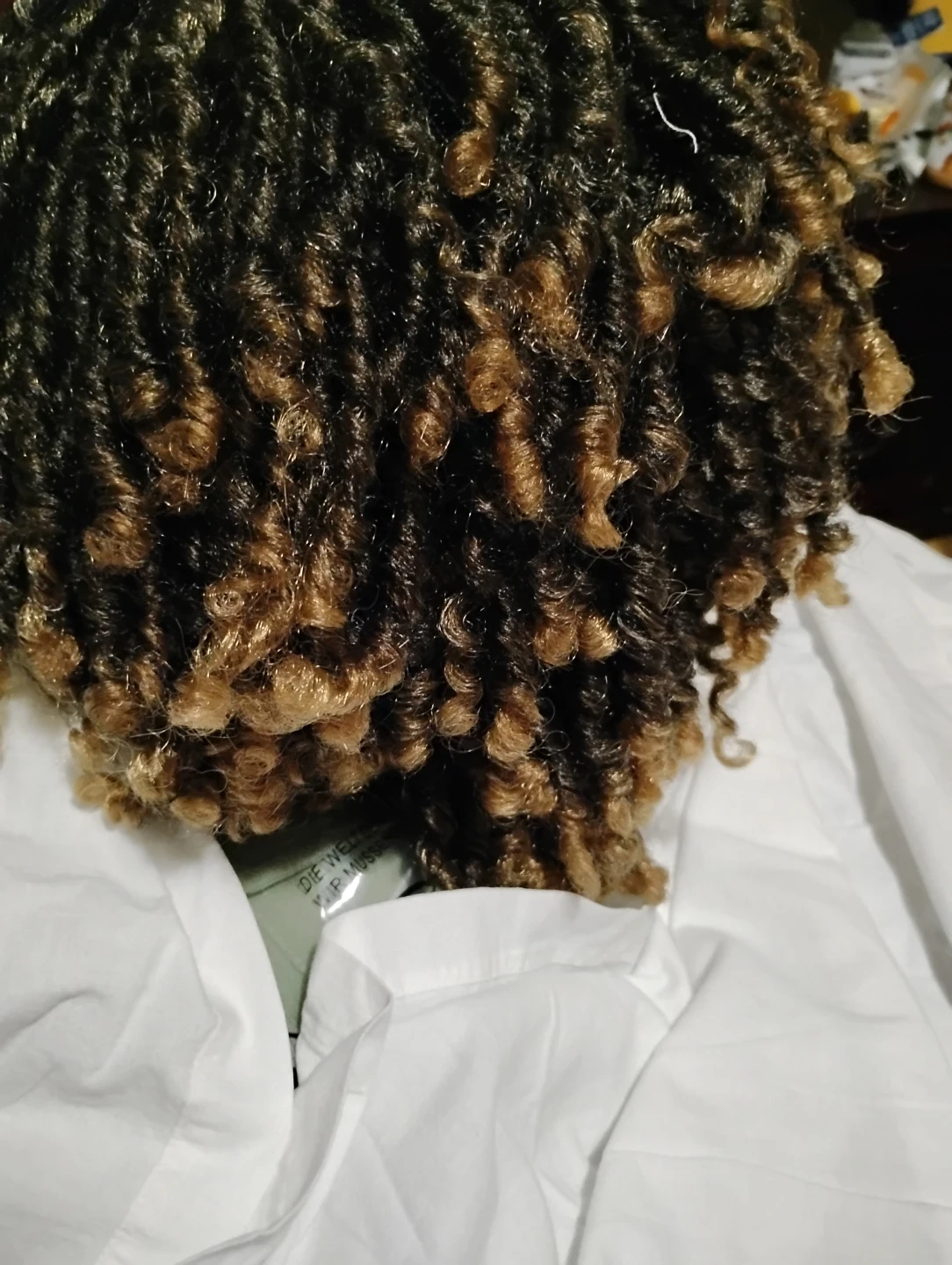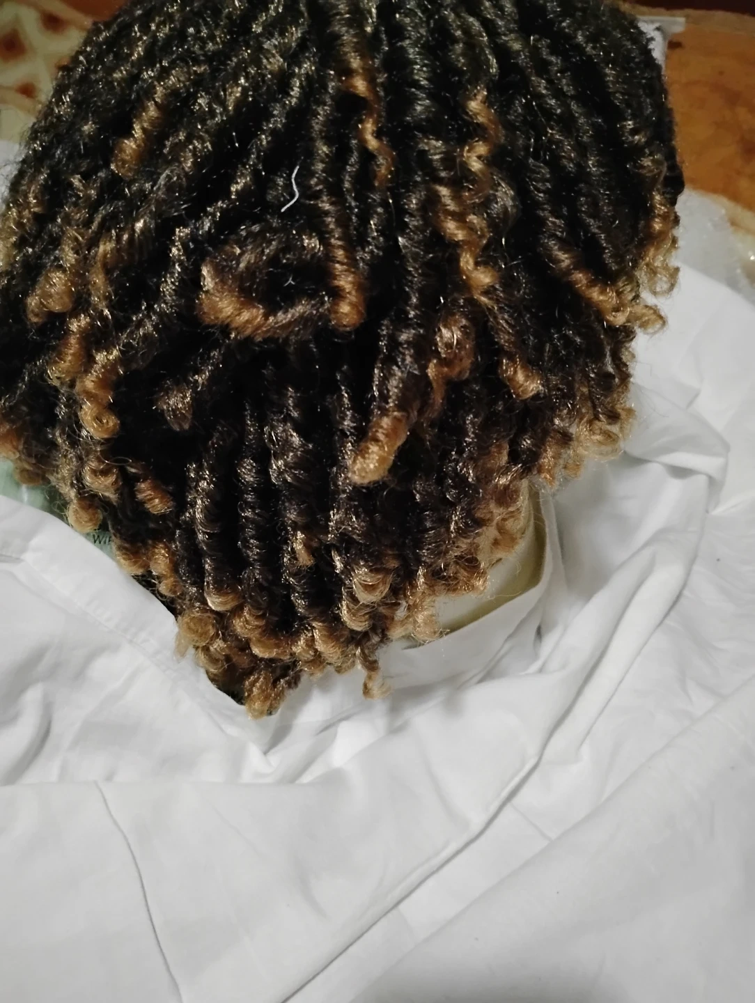 This wig features a twist-out style with beautiful brown and blonde highlights. The texture is designed to mimic natural curls. It's suitable for a quick style change or everyday wear.