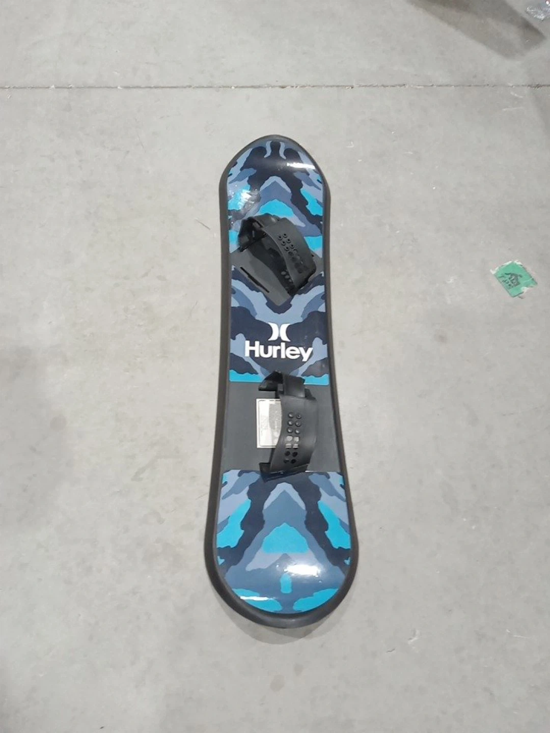 Hurley snowboard with adjustable bindings. It's got a cool camouflage design in blue and grey. Perfect for kids learning to snowboard!