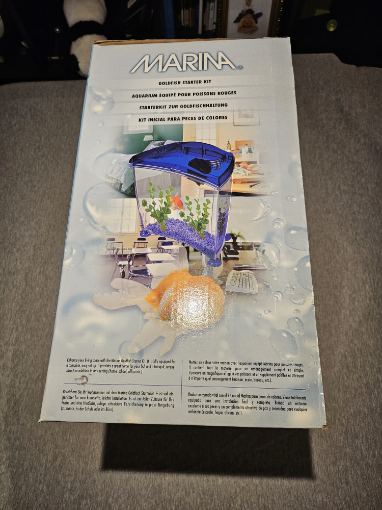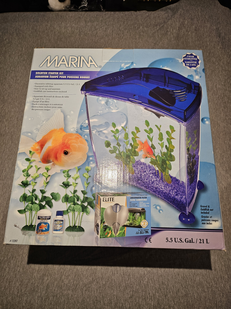 This kit comes with a 5.5 US Gallon aquarium and includes a filter, a gravel and goldfish net, fish food, water conditioner, and fake plants. Brand New In Box.