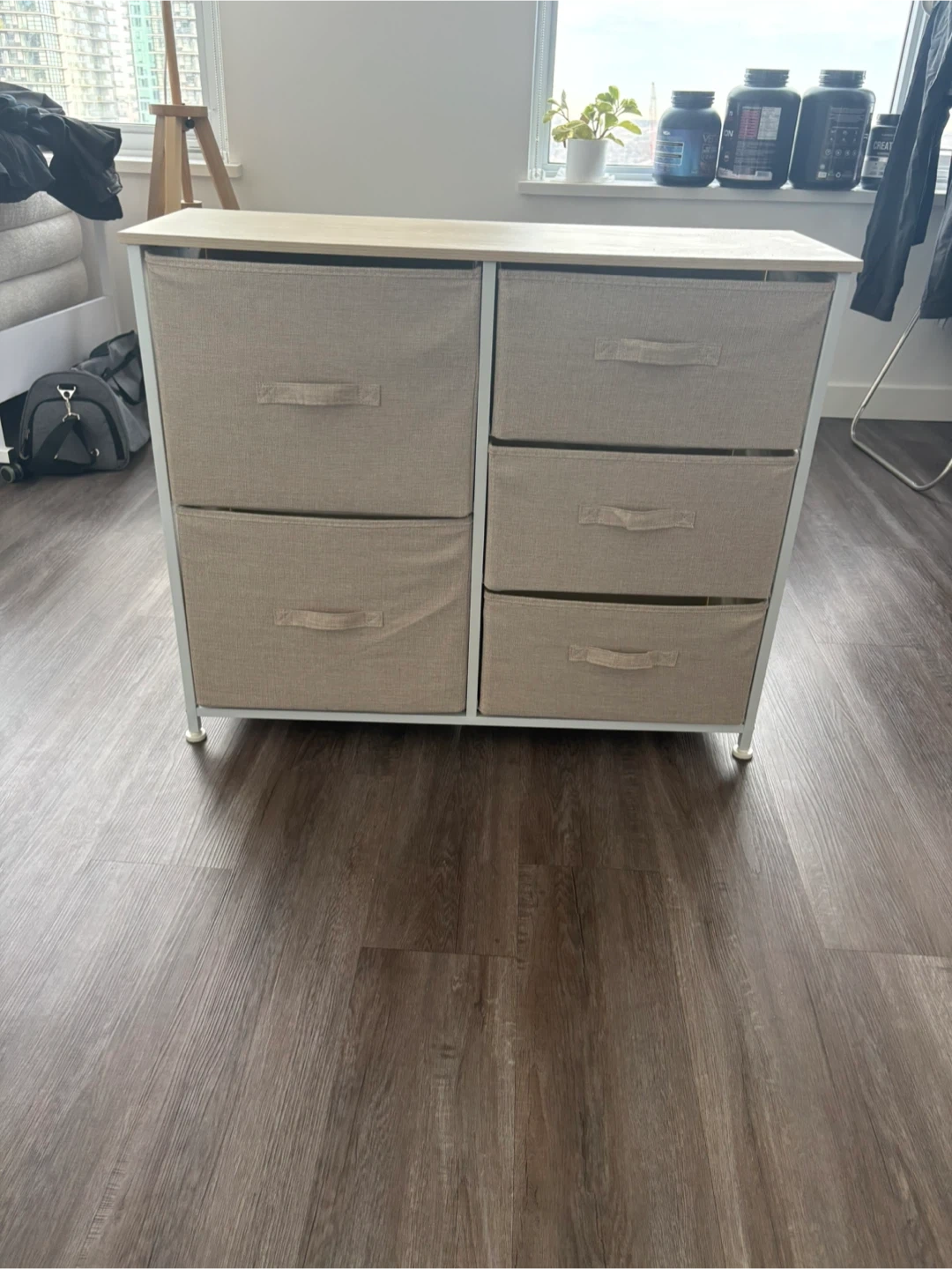 This storage unit features a white metal frame with a wood-look top. It has five fabric drawers in a neutral beige colour. The drawers have handles for easy access.