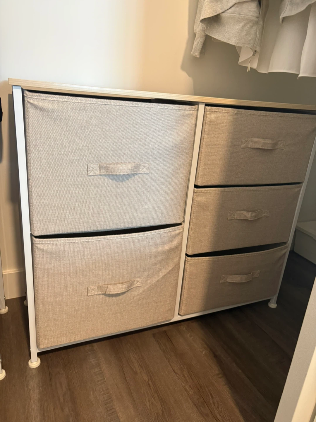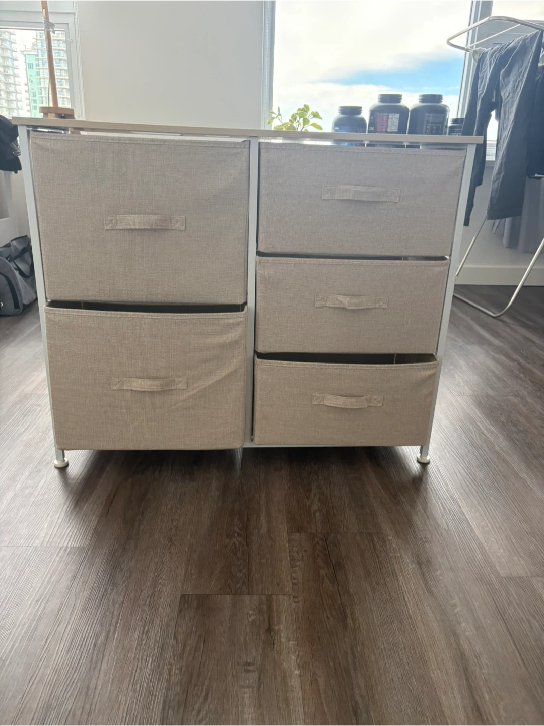 This storage unit features a white metal frame with a wood-look top. It has five fabric drawers in a neutral beige colour. The drawers have handles for easy access.