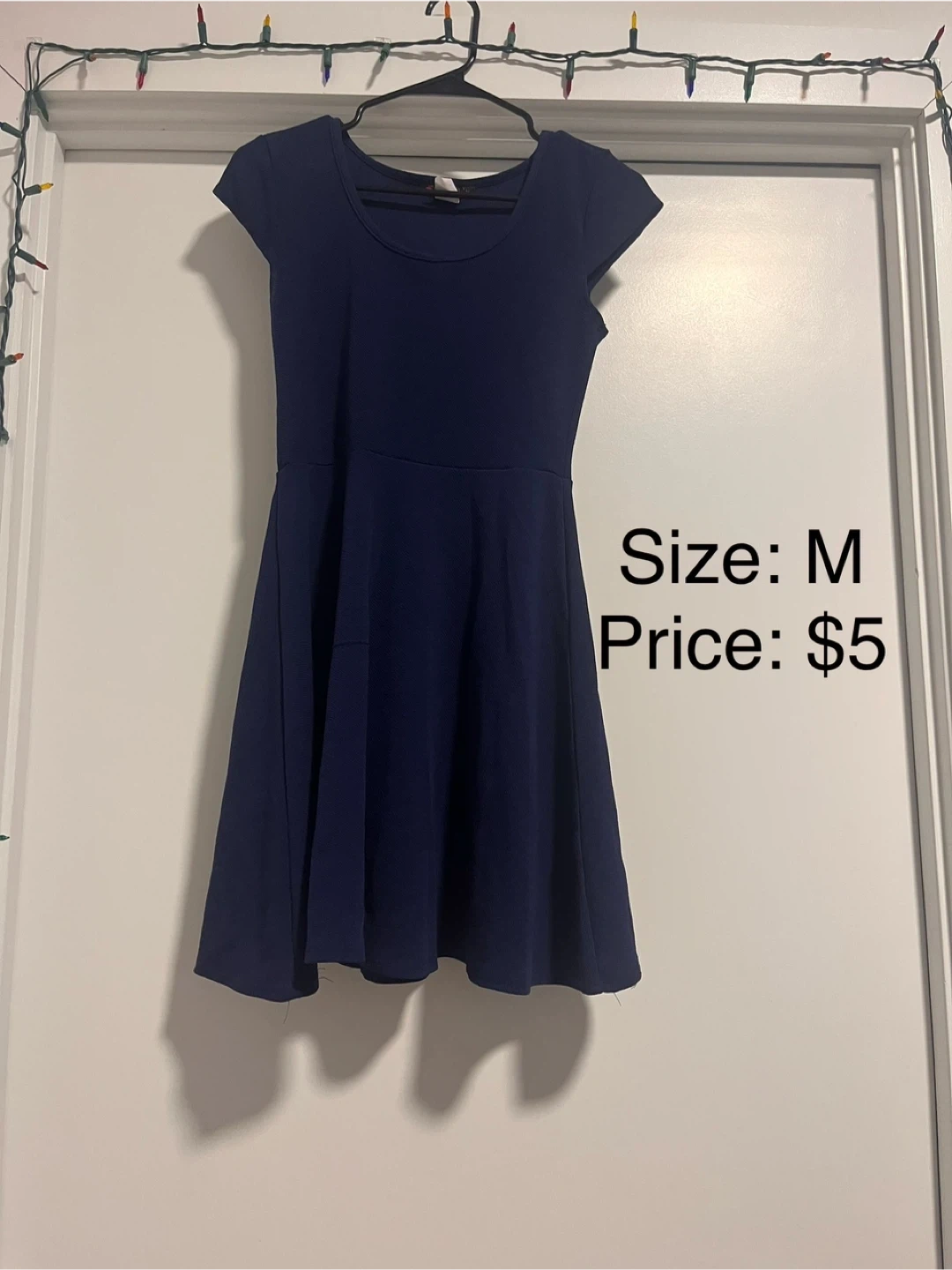 Navy blue dress with a fit and flare silhouette. It's a size medium. This dress is perfect for casual outings or can be dressed up for a more formal occasion!
