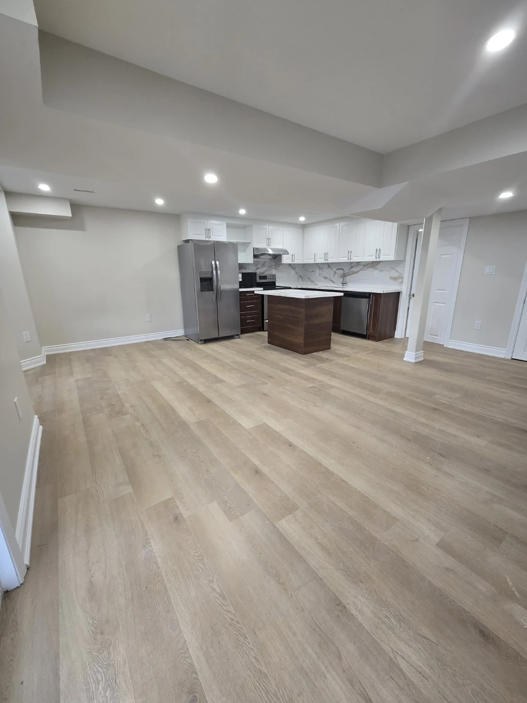 This modern basement apartment features a spacious open-concept layout, perfect for entertaining or relaxing. The kitchen boasts ample cabinet space and a stylish island with a marble-look countertop. Flooring is a light wood laminate throughout. It's ideal for a young professional or a couple seeking a stylish urban living space.