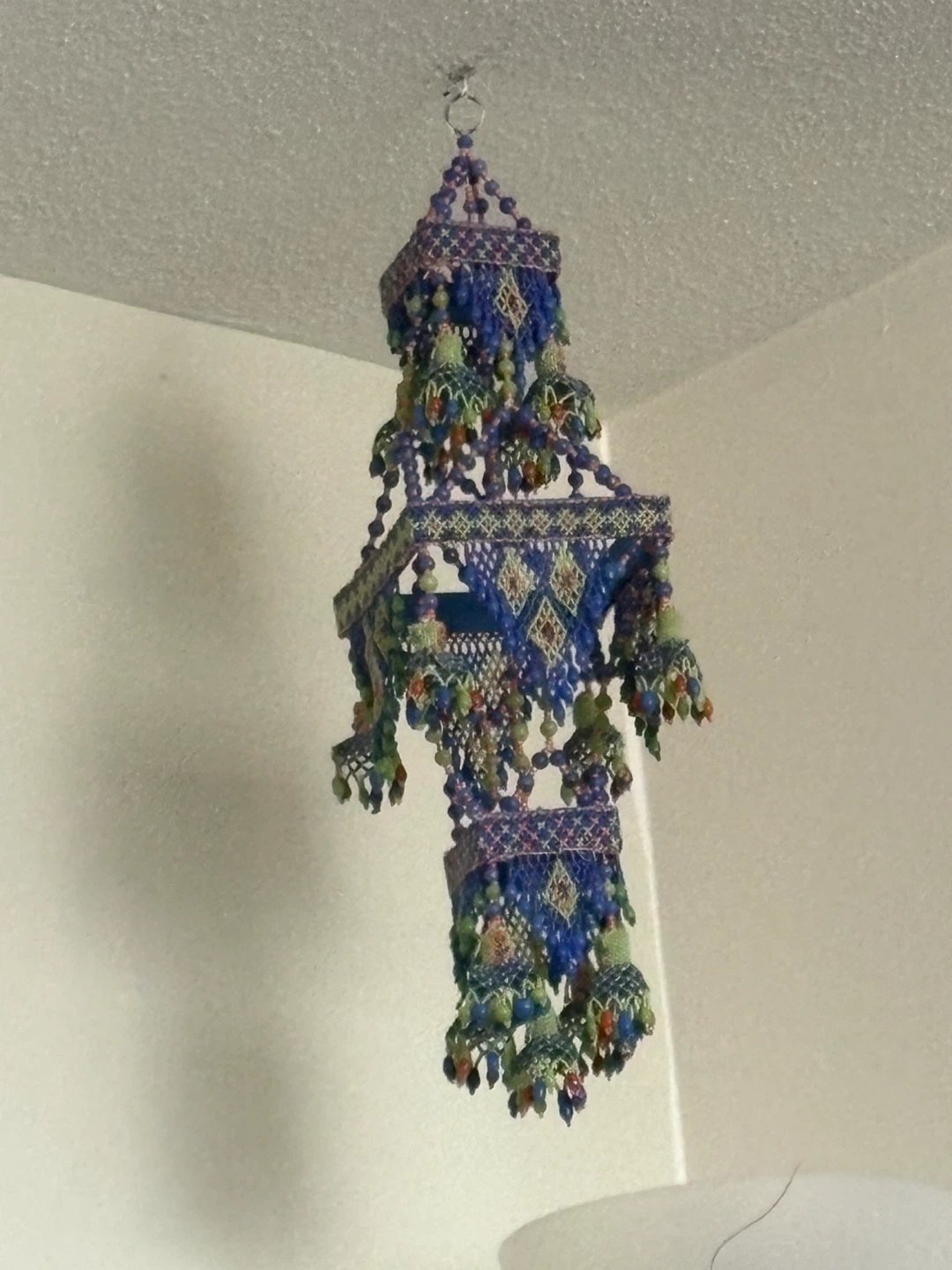 A unique beaded chandelier-style hanging decoration. It features intricate beadwork in blue, green, and other colourful accents. This decorative piece adds a touch of bohemian flair to any room!